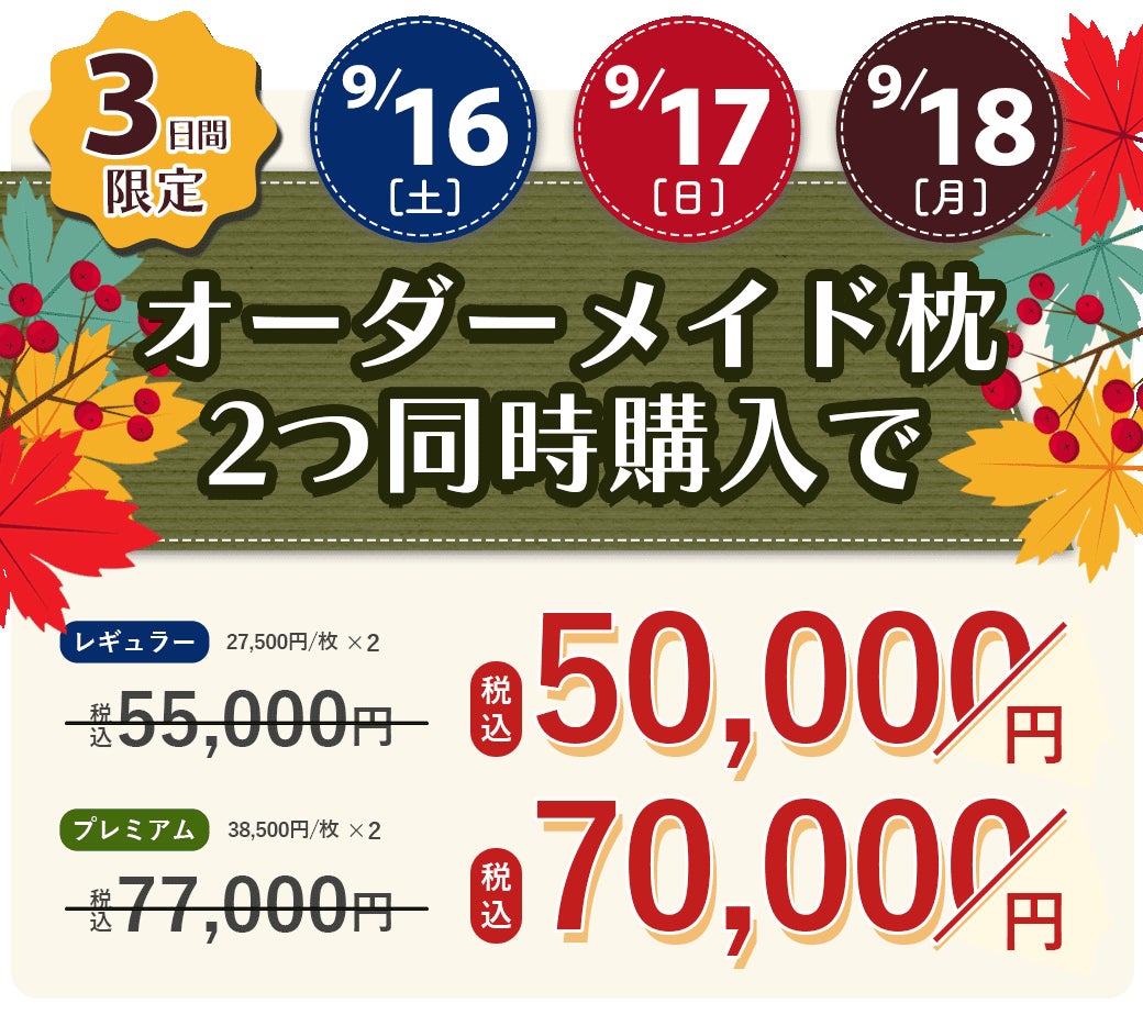 これは、おじいちゃん、おばあちゃんお二人とも元気でいてもらえるよう、オーダーメイド枕を2点同時購入でお得にお買い求めいただける『敬老の日 ペア割引』を2023年9月16日(土)、17日(日)、18日(月祝)の3日間限定で行うものです。