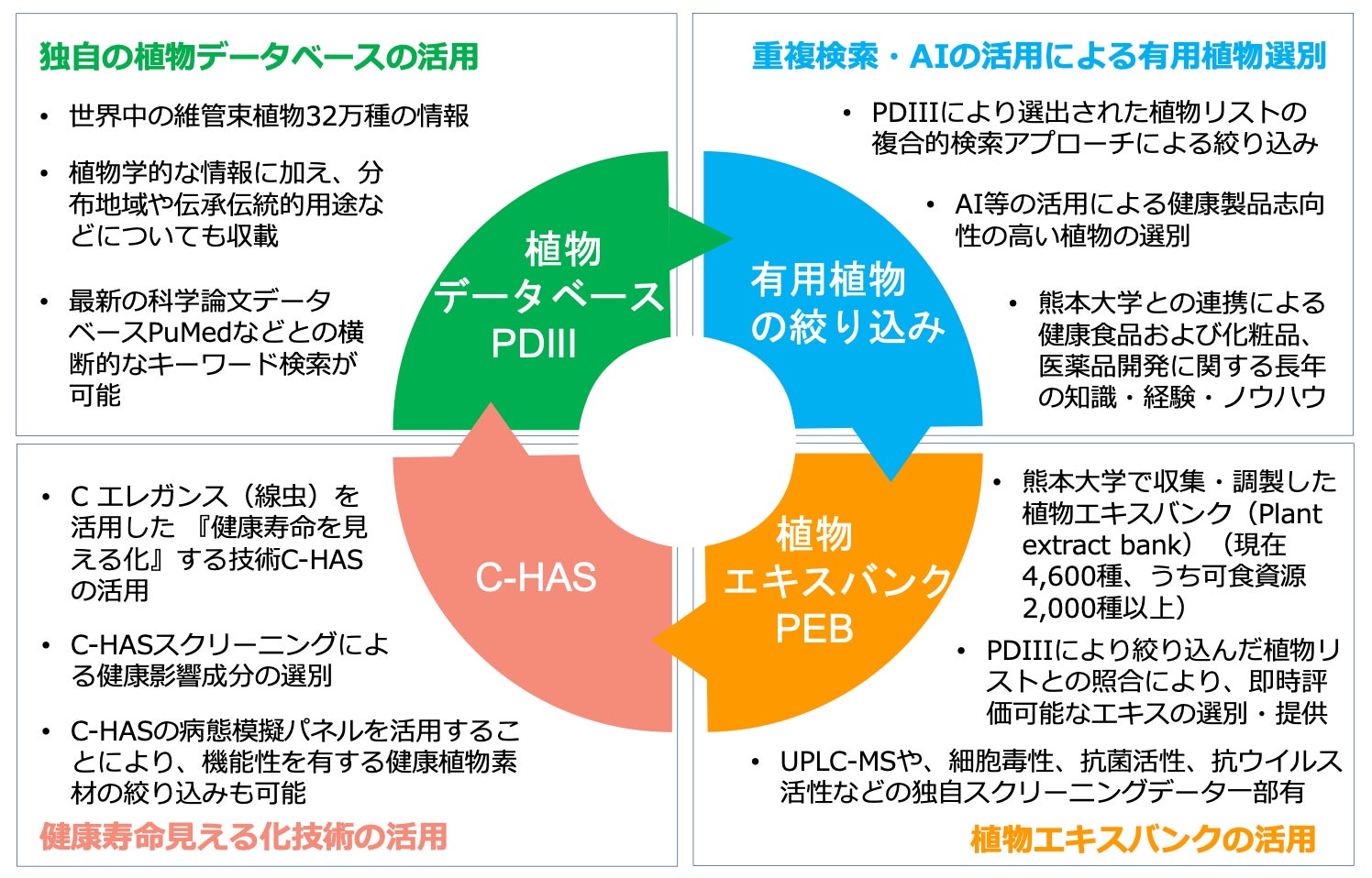 Cエレガンスを活用した評価のみならず、「化粧品や機能性食品の原材料となる植物素材に関する情報」を独自の植物データベースや知識・経験・ノウハウ等の活用により、網羅的かつ効率的に調査し、提供することが可能です。さらに情報提供のみならず、独自のエキスバンクや最新の科学技術を活用した機能性食品や化粧品等の開発なども可能です。シーズの枯渇や資源の入手リスクなど課題を抱えている企業様に対して、世界中のかつ有用なシーズを探索し提案し、開発を支援します。