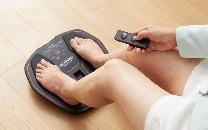 Foot Fitシリーズは、座ったまま裸足で足を乗せることで、EMS(筋電気刺激)が足裏、前すね、ふくらはぎといった歩くときに使う筋肉にアプローチし効率的に鍛えます。