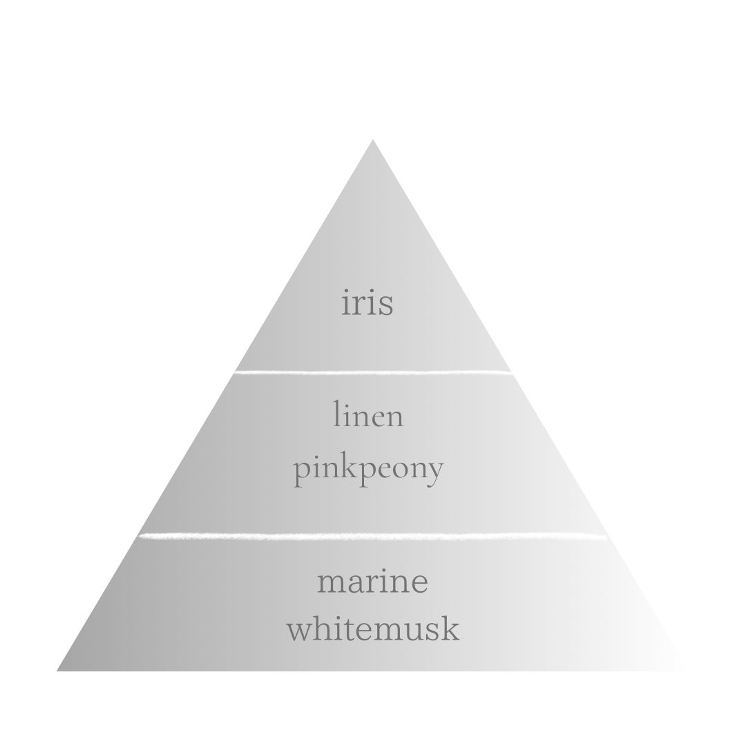 イリスのパウダリーさとリネンのアコードが清潔感のある洗濯した後お日様を浴びたシーツやシャツ、まるで優しい柔軟剤の様な清潔感を表現。