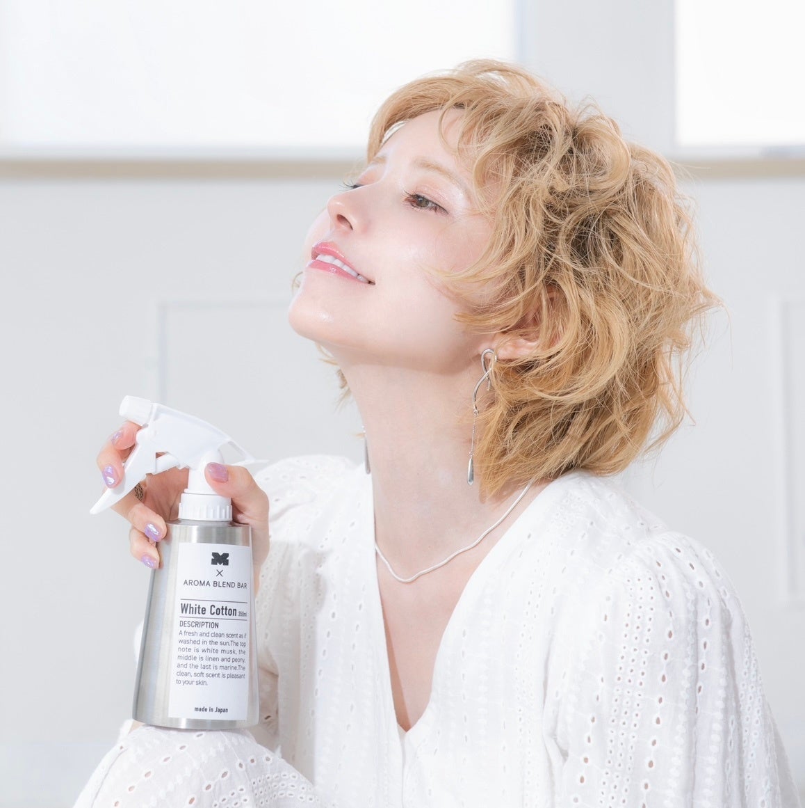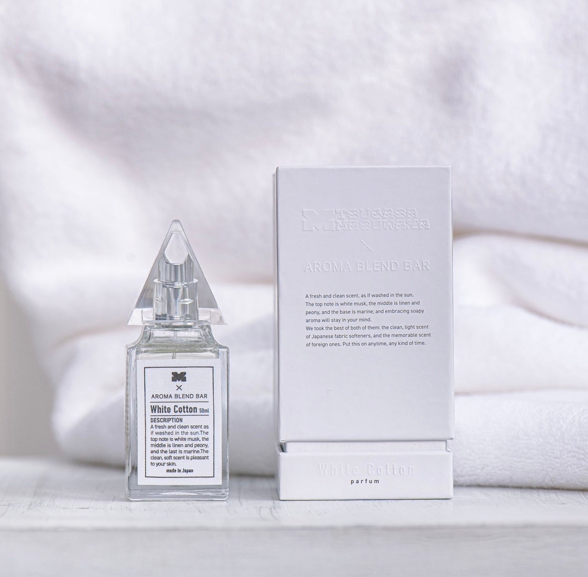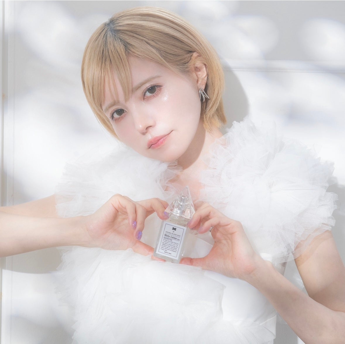 今回のコラボレーションではカラーコンタクトやコスメ用品等数々のヒット商品のプロデュースを行う益若つばささんと、aromablendbarの調香師、和崎純也が一から共に調香をし約半年間かけて理想の香りを完成させました