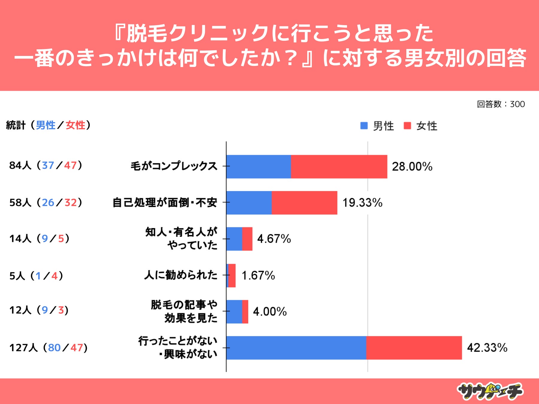 【女性の方が脱毛クリニックに行くきっかけが「毛のコンプレックス」と回答した割合が高く、男性と比べて約1.5倍に】