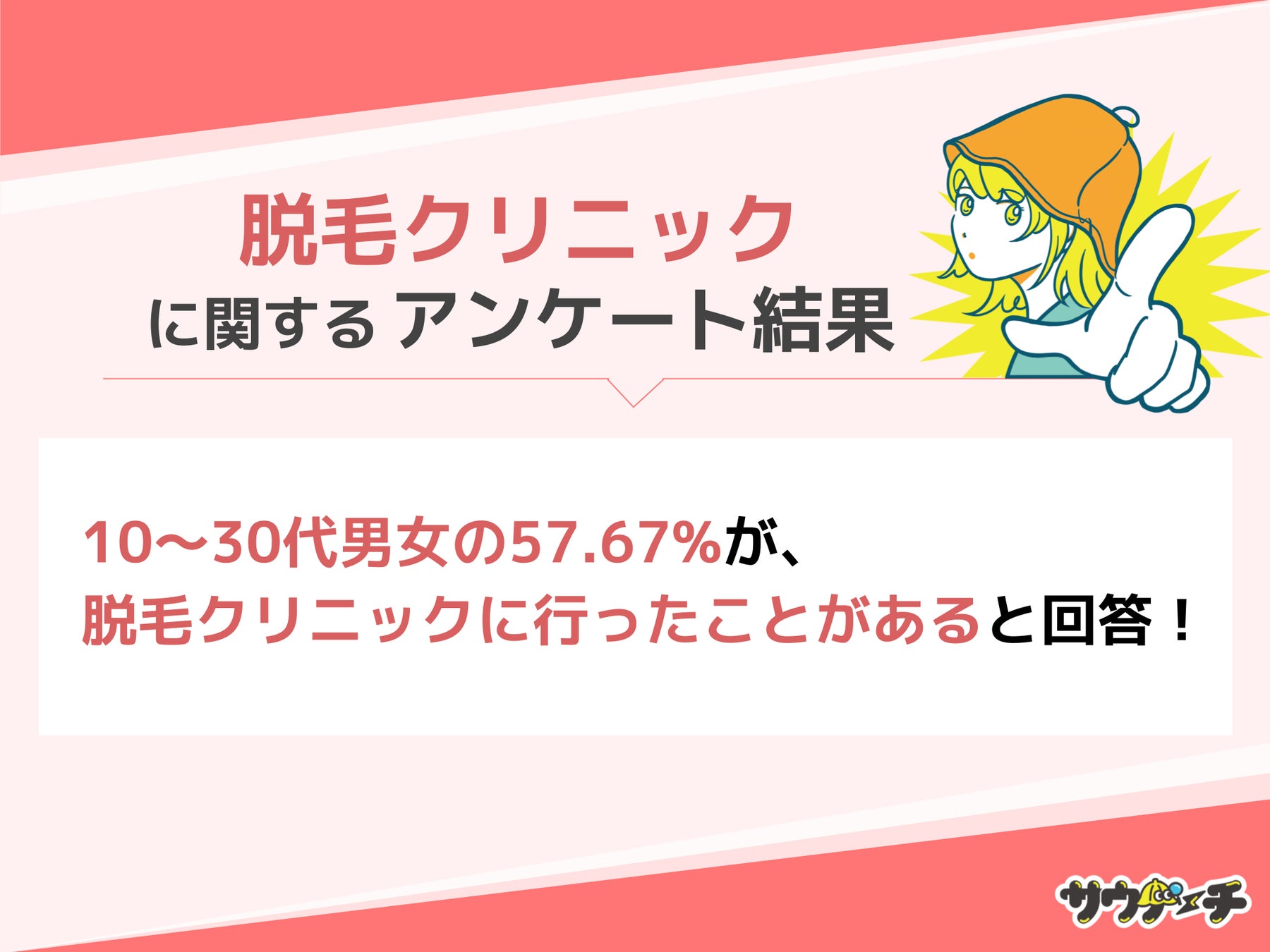 次いで多かったのが「毛がコンプレックス」と回答した方の28%、「自己処理が面倒・不安」という回答が19.33%、「知人・有名人がやっていた」という回答が4.67%、「脱毛の記事や効果を見た」という回答が4%、「人に勧められた」という回答が1.67%で、10〜30代男女の約6割が脱毛クリニック行ったことがあるという結果になりました。