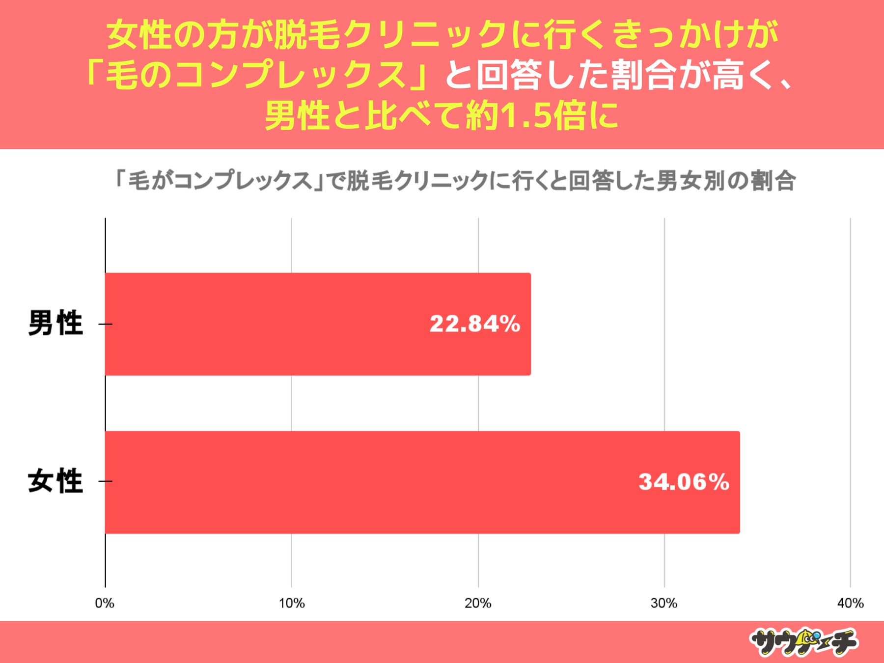 脱毛クリニックに行くきっかけが「毛のコンプレックス」と回答した割合を男女別でみてみますと、男性が22.84%、女性が34.06%と、男性より女性の方が約1.5倍高い結果となりました。