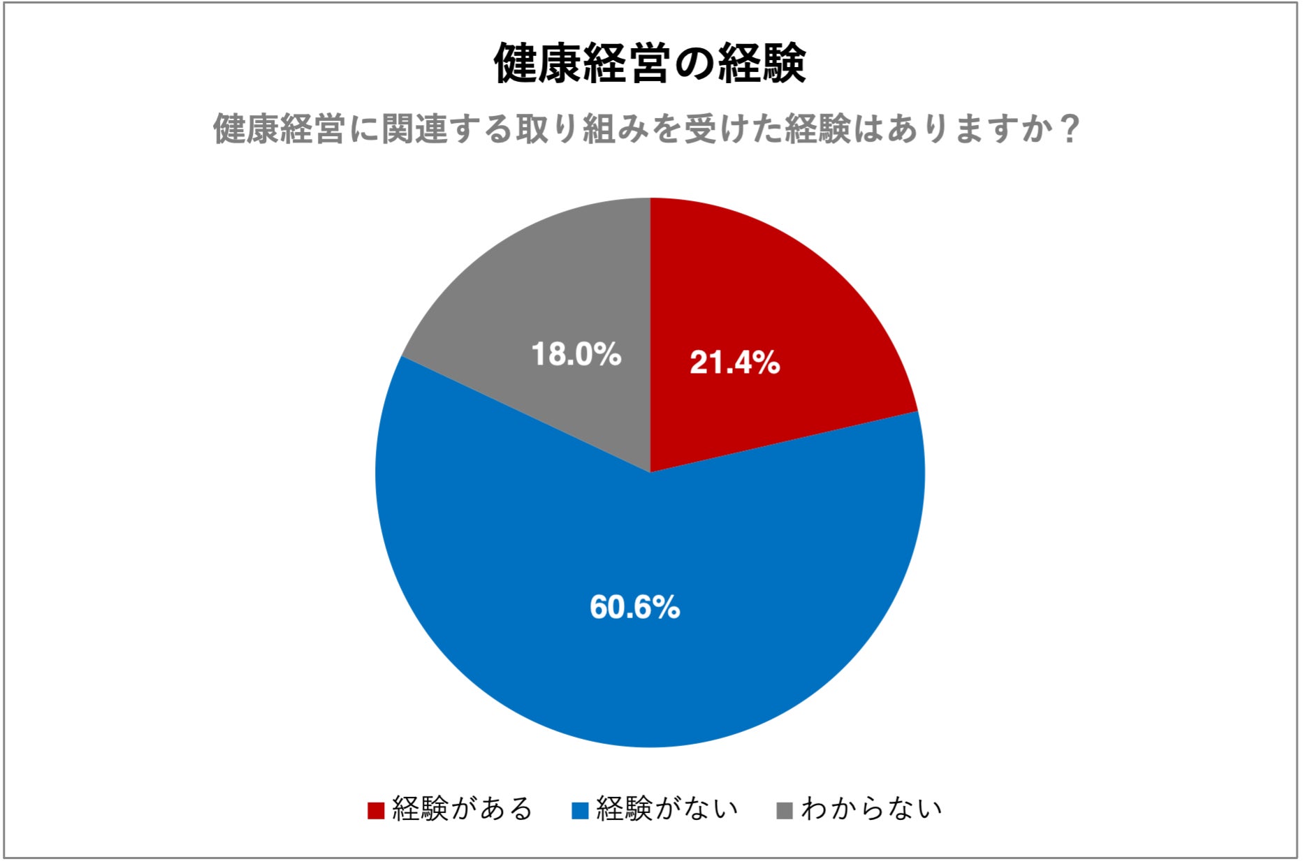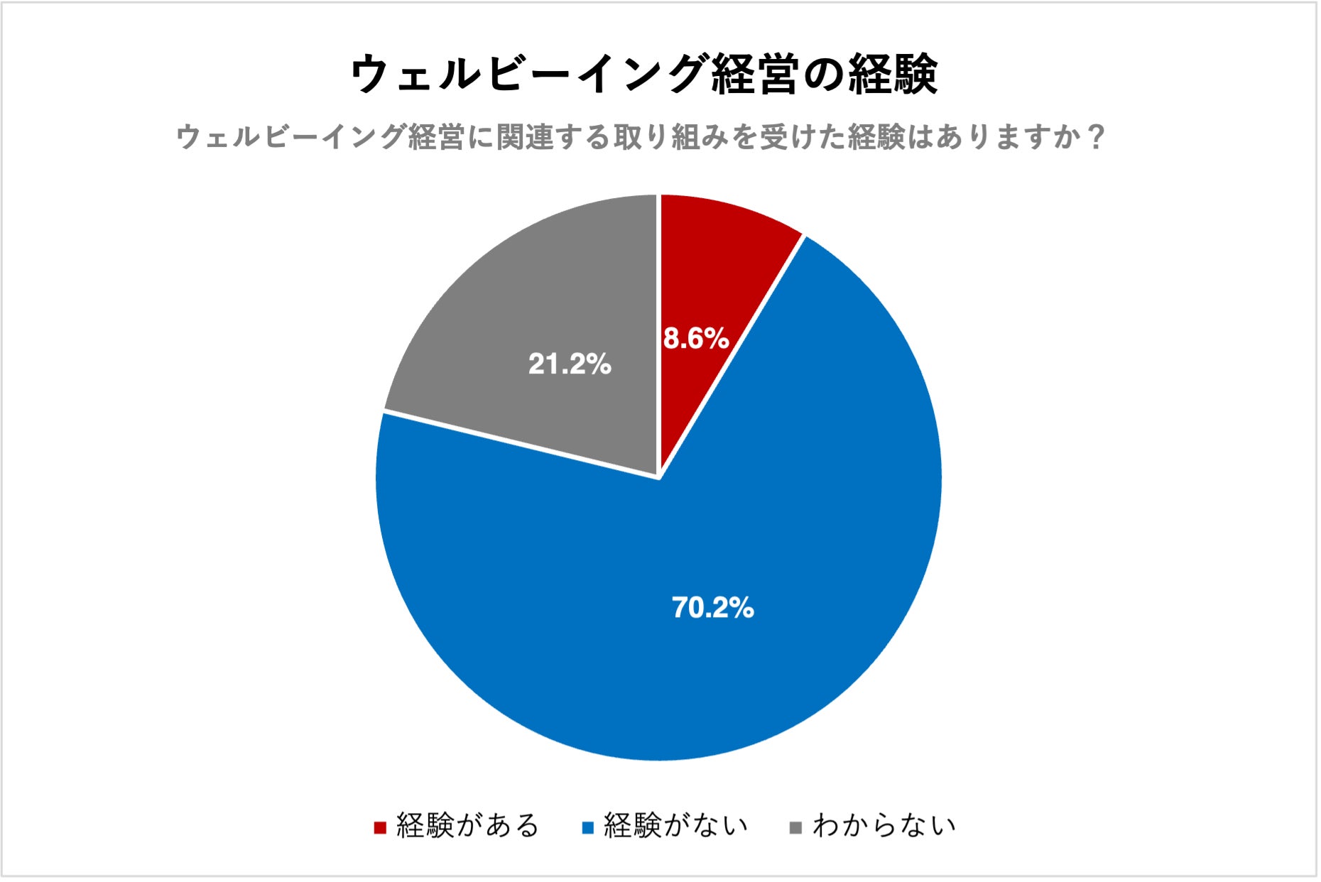 認知率は、健康経営の経験があると答えた人は、21.4%。ウェルビーイング経営を経験があると答えた人は、8.6%。