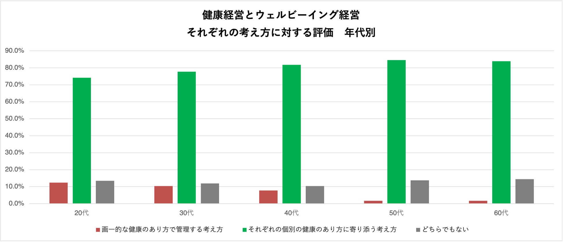 仮説としては、年齢を重ねるごとに、健康に対してより自分ごと化し、自身の健康に対する真剣度が上がり、所属する組織でも、画一的な健康の基準で管理する健康経営よりも、各個人の健康のあり方に寄り添うウェルビーイング経営への支持が高まる可能性がある。