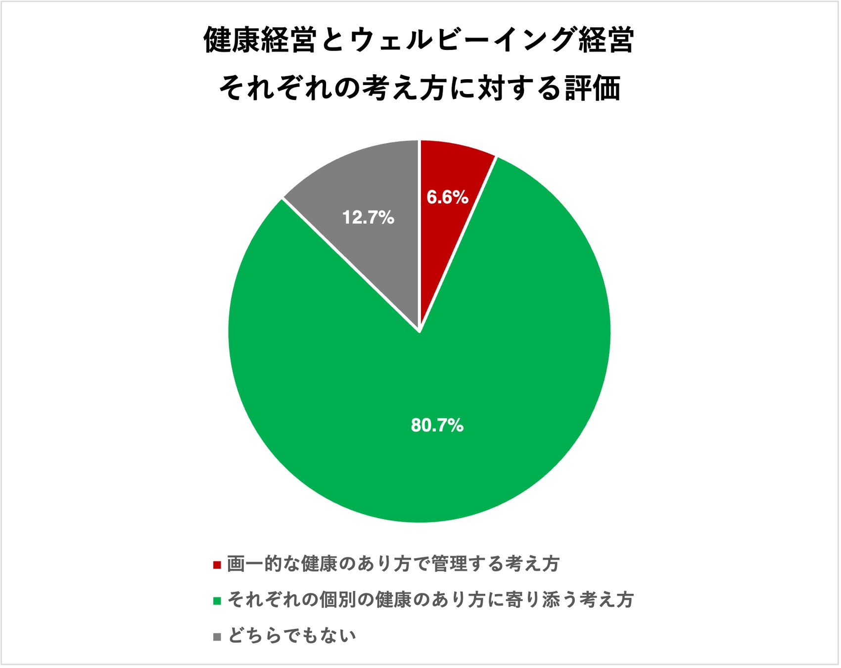 健康経営の考え方を支持すると回答した人が6.6% ウェルビーイング経営の考え方を支持すると回答した人が80.8% わからないがと回答した人12.7%であった。