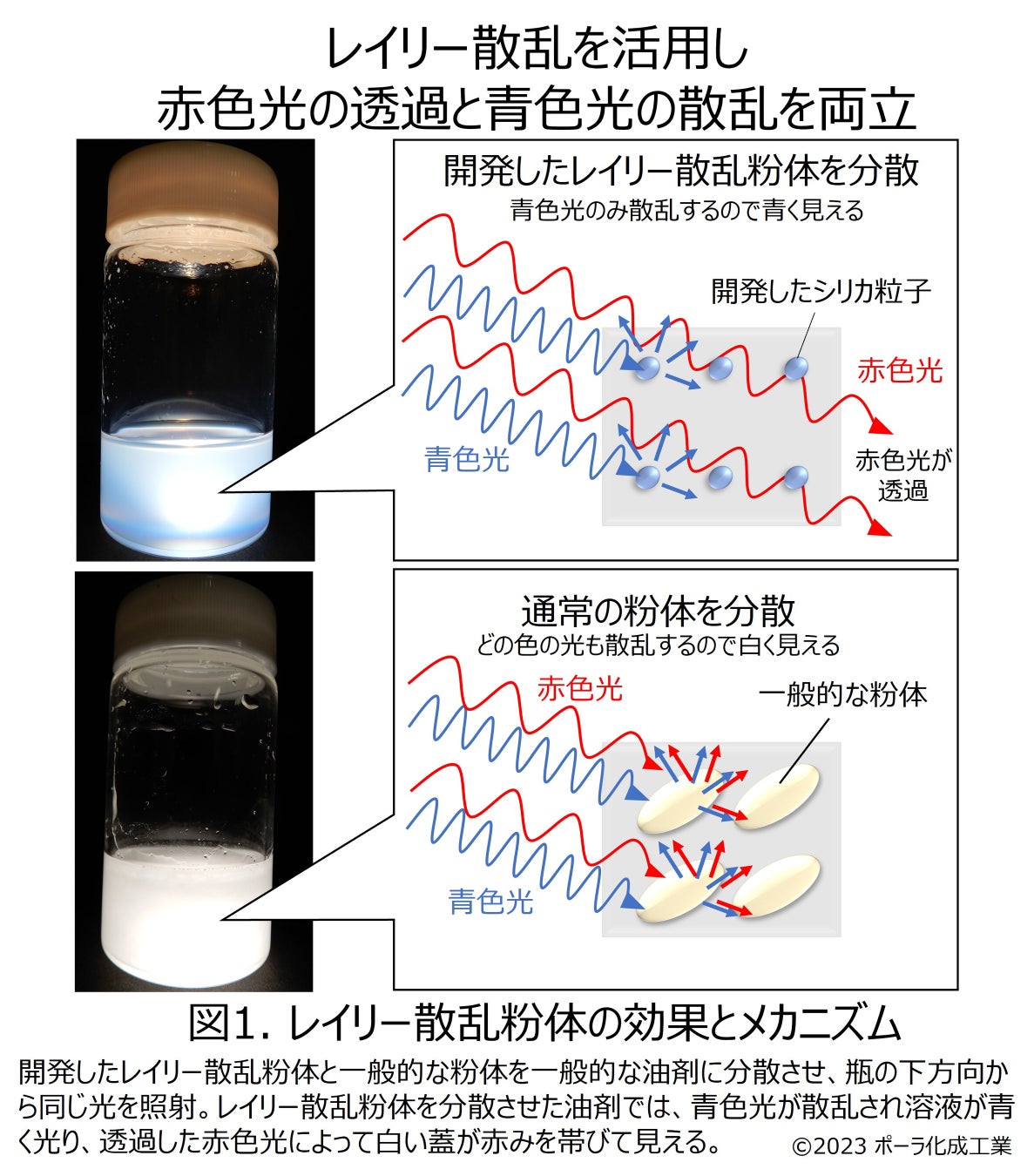 そこで、凝集を抑制する表面処理を施し、レイリー散乱を起こしやすい状態を維持できるシリカ粒子を開発しました。開発した粒子を一般的な油剤に分散して評価した結果、赤色光の透過と青色光の散乱を両立することが確認できました(図1)。