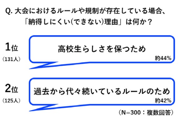 大会におけるルールや規制が存在している場合「納得しにくい(できない)理由」は何かを聞いたところ、部活生が挙げたもので1番多かったのは「高校生らしさを保つため(131人・約44%)」 2番目に多かったのは「過去から代々続いているルールのため(125人・約42%)」という結果となりました。(複数回答)