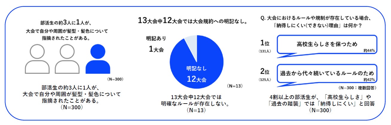 調査の結果、部活生の約3人に1人が大会で髪型・髪色について自分や周囲が指摘されたことがあると答えた一方で、 13大会中12大会では大会規約に髪型や髪色に関する記載がないことが明らかになりました。