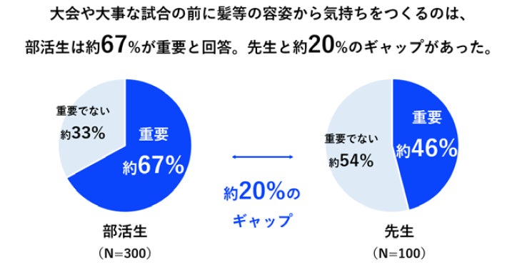 部活生300人と顧問の先生100人に対して、「普段の練習時と比べ、大会や大事な試合の前に髪等の容姿から気持ちをつくることはどの程度重要だと思いますか。」と聞いたところ、部活生は約67%が「とても重要だと思う」「重要だと思う」と答えたのに対し、先生は約46%という結果となりました。