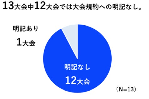 約3割の部活生が大会で自分や周囲への指摘があったとする一方で、部活生が参加する全国大会・地方大会に、髪型などの自己表現に関する規約があるかを調査したところ、13大会中、12大会では明確な記載が存在しないことが判明しました。部活生が指摘されている割合に対して、規約での記載は少ないことが判明しました。