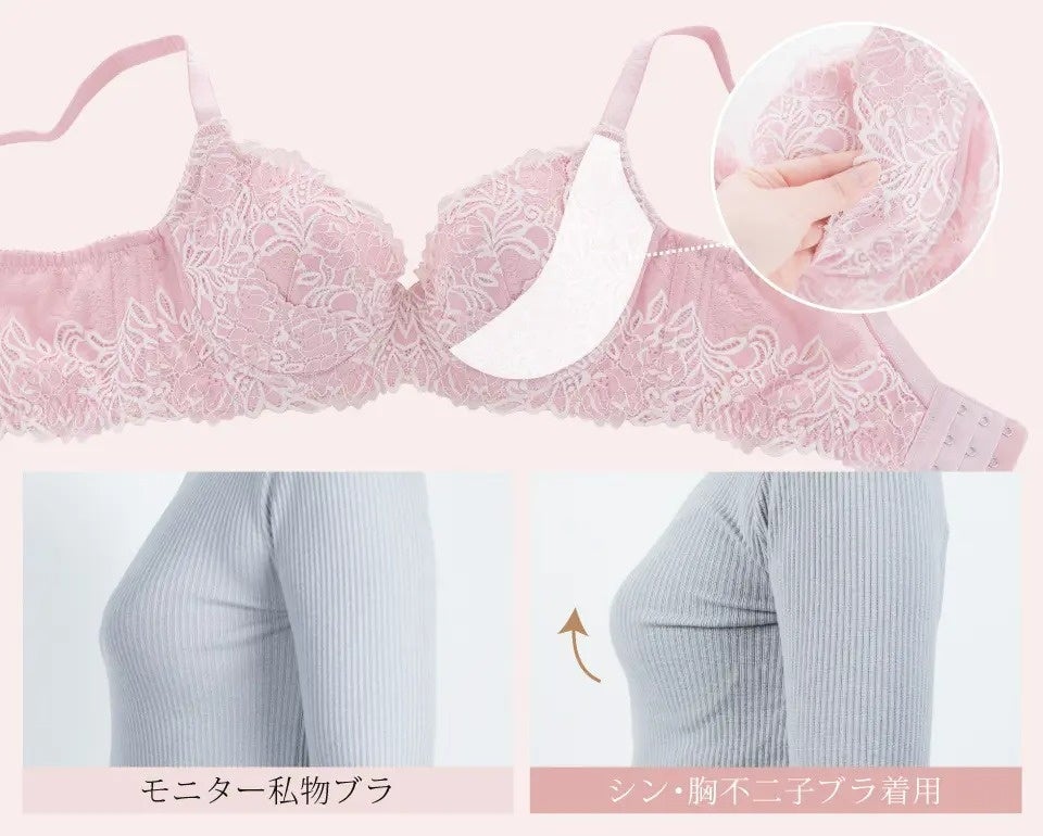 下着を作り続けて45年以上というベテラン職人の知見を詰め込んだ立体設計だからこそ、平置きの状態でもこの立体感と寄り感!バストに負担がかかるパッドで無理に寄せたり上げたりするのではなく、薄手の立体カップで自然なボリューム感に整えてくれます。(左右差を調整するための薄手のパッドは付属しています)