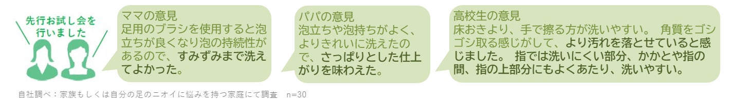 かかとの荒れ(かさつき・ひび割れ)、むくみ、水虫、汗・ムレ、ニオイといった足の悩みがある20代~60代の男女813名に、フットケア関連商品で使ってみたいアイテムを調査したところ、1位「かかとがつるつるになるフットブラシ」(29.3%)、2位「汚れ・角質がしっかり落とせるフットブラシ」(27.9%)という結果に。フットケアの方法として、フットブラシへの興味が高いことがわかりました。そこで、手軽にフットケアをしていただくため、足の様々な悩みをまとめてケアできるフットブラシを発売しました。