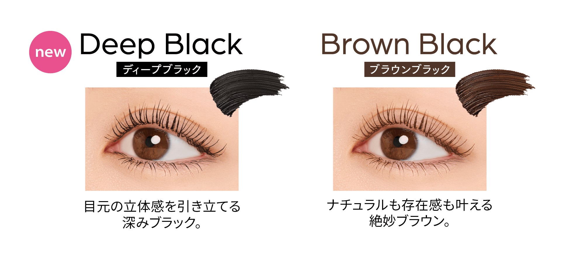 耐久カールマスカラは2023年4月に限定発売し、「軽い塗り心地でカール力が持続する」「小さいブラシが塗りやすい」「重ねてもダマになりにくい」と好評を博した商品です。中でも「ブラウンブラック」を継続販売して欲しいといったお客様のお声を多くいただき、さらにメイクトレンドで人気が高まっているブラックカラーを新色として加えた全2色を定番商品として発売する運びとなりました。