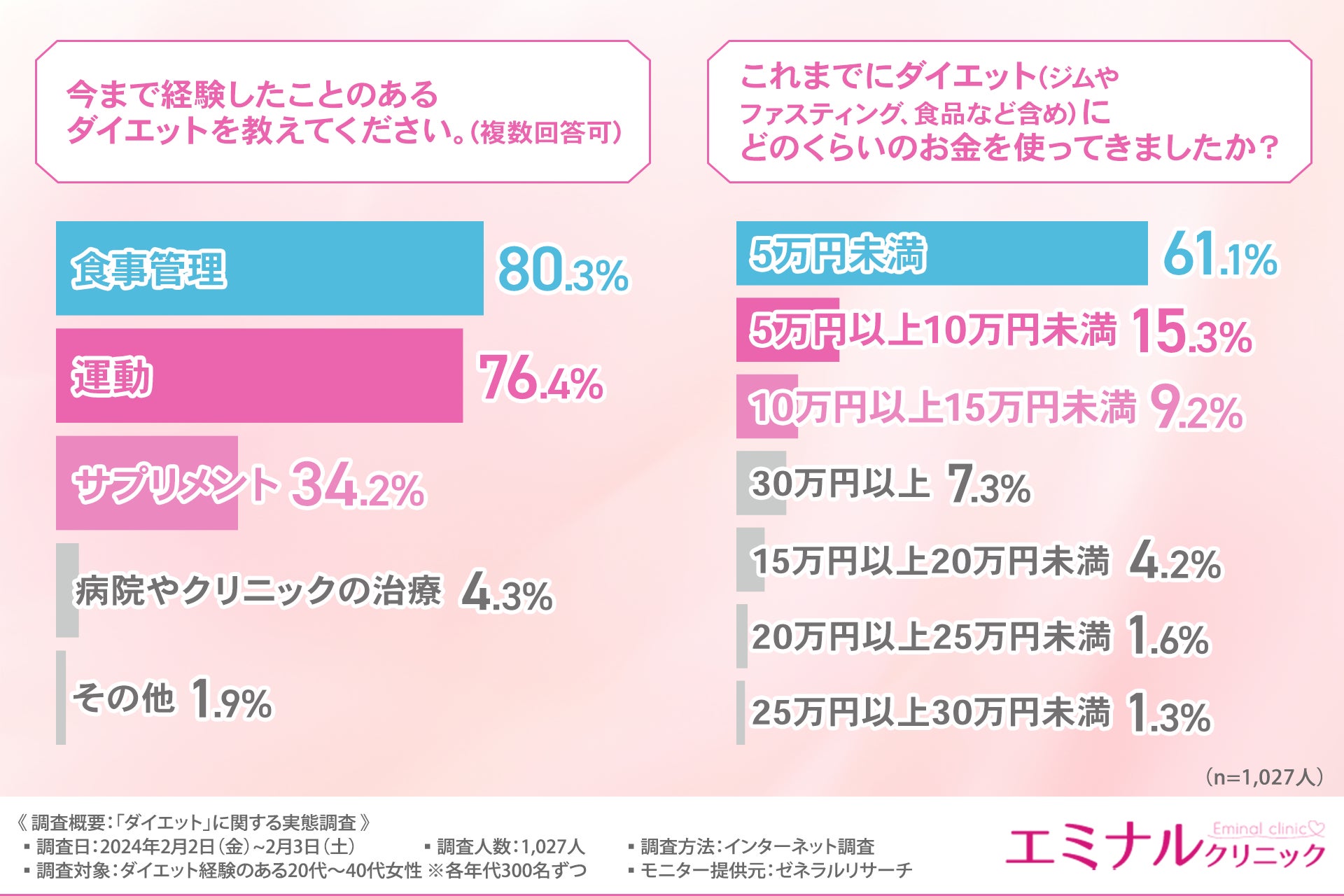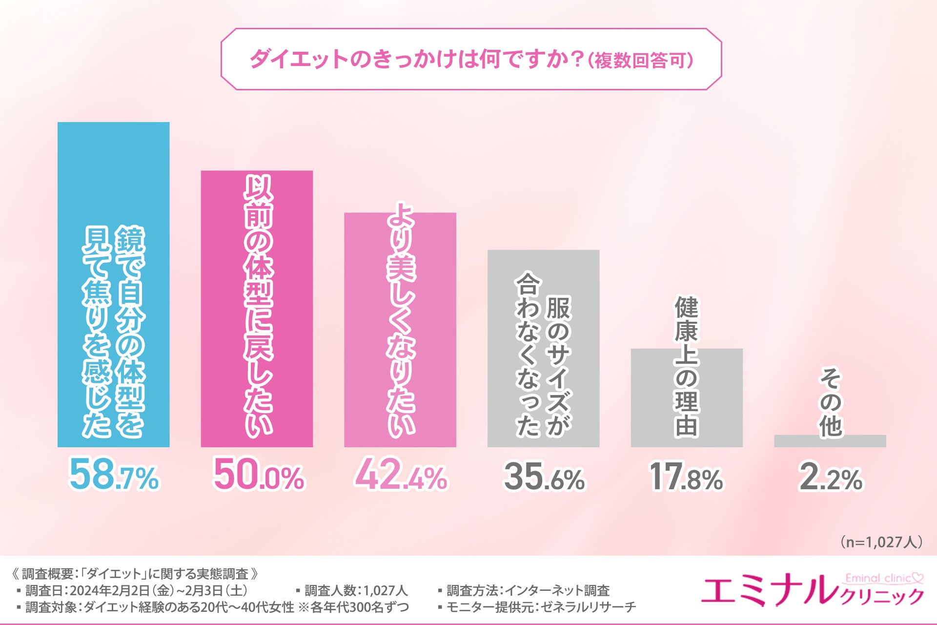 そこで今回、美容医療サービスを提供するエミナルクリニック(https://eminal-clinic.jp/lp01/medicaldiet/)は、20代~40代の女性を対象に「ダイエット」に関する調査を実施しました。