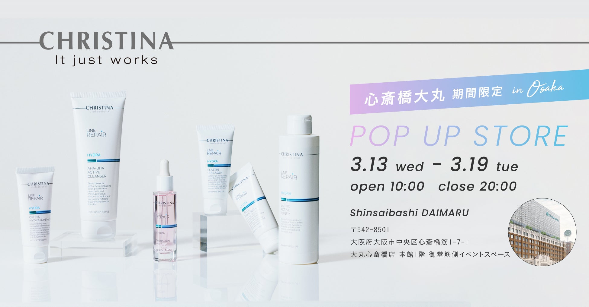 日本での販売開始以来、提携サロンでのカウンセリング後の購入か、クリスティーナ公式ECサイトからの購入のみに限られていた「クリスティーナ」。今回のポップアップでは、昨年夏にリリースされた「ラインリペア」シリーズも店頭に勢ぞろいします。