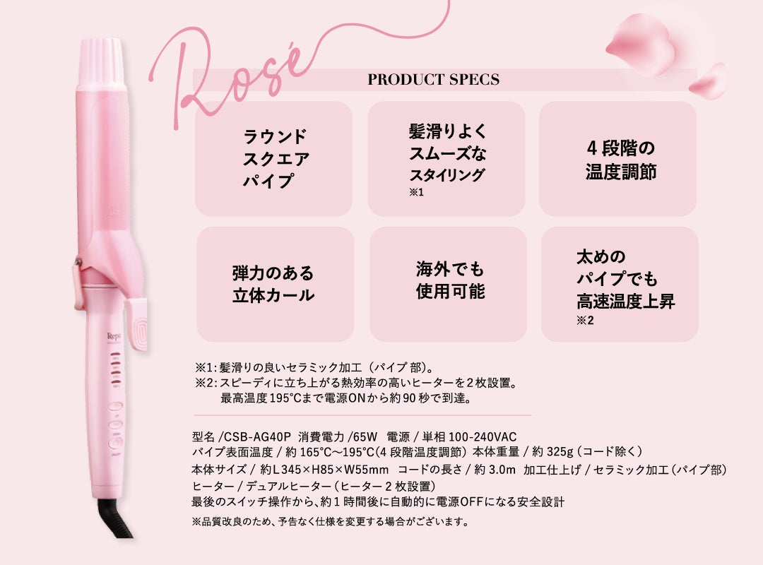 美容大国韓国ならではの技術とアイデアから生まれた機能性の高いRepitは、都内の美容師やインフルエンサーの口コミによって広まり「韓国アイドルみたいな女神ヘアが簡単につくれる」「巻くのが苦手だけど、しっかり大きなカールができて長持ちする」など、SNSでも話題沸騰となりました。そして、2024年3月、レピ スクエアバー初の限定カラー「レピ スクエアバー40mm ロゼ」が新登場いたします。
