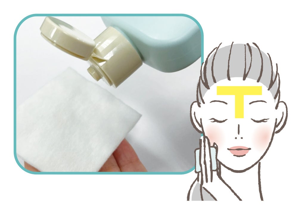 ●洗顔後、コットンに適量を含ませ、Tゾーンを中心にふきとるようになじませます。