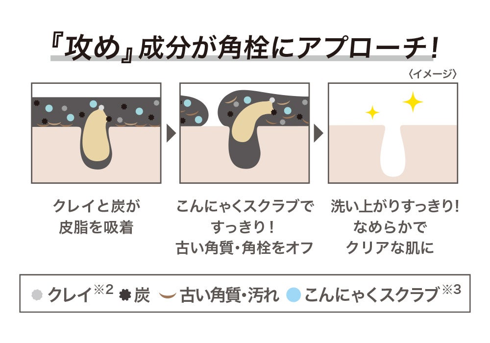 クレイ※2と炭が皮脂を吸着し、スクラブのこんにゃく粒※3が古い角質や角栓をからめとります。