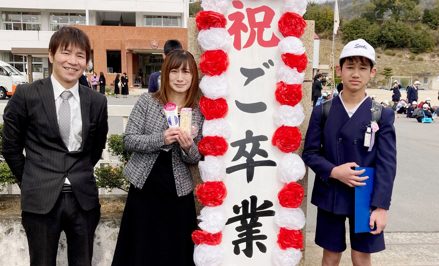 地域に貢献したい、地域の子供を応援したいとの想いで、自社工場のある岡山県和気町内小学校計7校(和気町立佐伯小学校・山田小学校・本荘小学校・和気小学校・藤野小学校・日笠小学校・石生小学校)に2009年3月から毎年、卒業記念品として化粧品を贈呈してきました。2012年3月には和気町内中学校にも取り組みを広げ、計2校(和気町立和気中学校・佐伯中学校)に贈呈を開始。その後、2017年の小学校統合により、現在は計3校(和気町立佐伯小学校・本荘小学校・和気小学校)に贈呈しています。