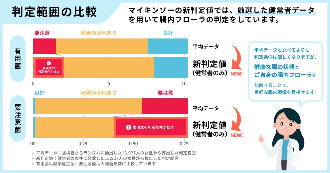 健常者に限定をして判定値を算出することで、ご自身の腸内細菌叢が ” 健康な状態の腸内細菌叢と比べてどういった状態であるのか ” が分かる検査結果を提供しています。今回の新判定値では、健常者の条件をこれまでよりも更に厳選したことで、より精度の高い健康な腸内細菌叢の指標を設定することができたと考えております。「細菌叢で人々を健康に」という企業理念のもと、今後も細菌叢データベースの構築と研究・解析を進め、マイキンソーの品質向上に努めて参ります。
