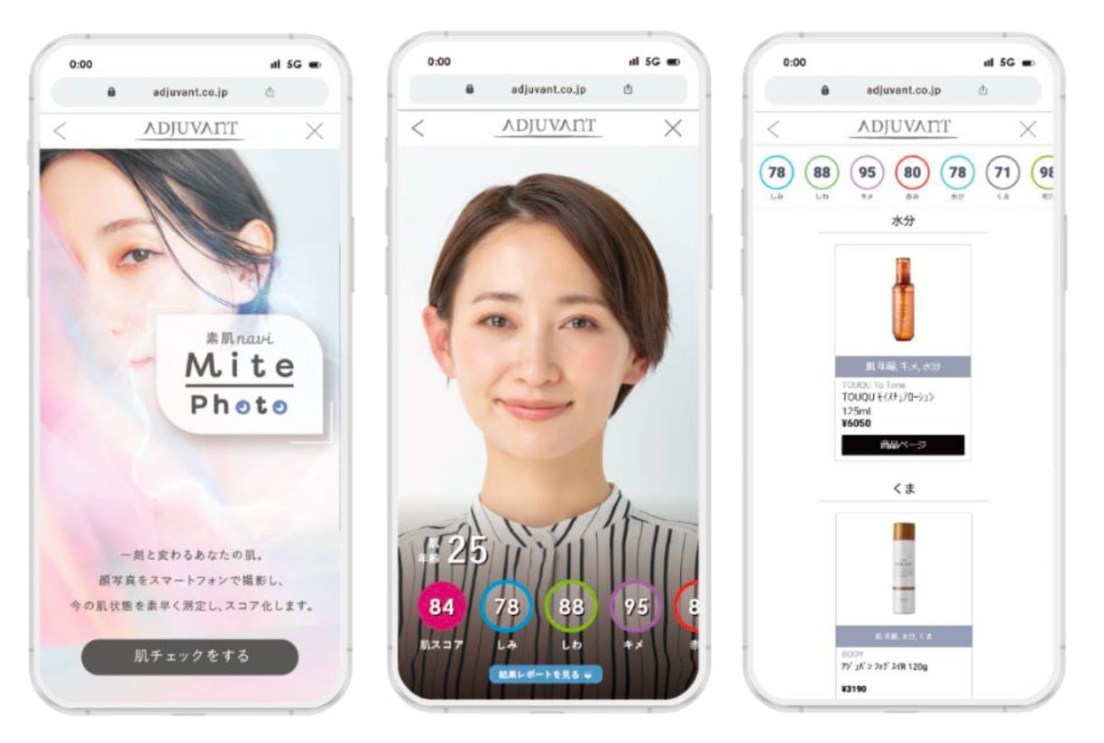 本サービスは、理美容室から紹介を受けて会員登録を行い、専用の会員サイトにアクセスすることでご利用いただけます。解析できる肌悩みは、シミ、しわ、キメ、くま、うるおい、毛穴、赤みの7項目。利用者は「ADJUVANT LINK」のマイページで肌解析を行なうことで、取り扱いスキンケアアイテムの中から今の自身の肌状態に最適なアイテムを見つけることができます。今後も対応アイテムは随時増える予定です。