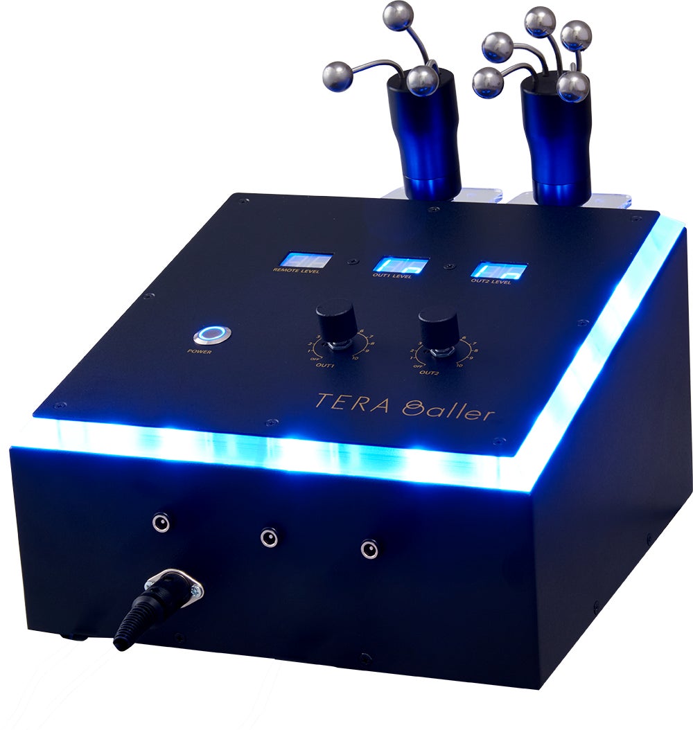 美顔筋SOSEIの理論を体現したオリジナルマシン「TERA Baller」。赤筋に対して効率的に働きかけるために開発された表情筋のトレーニングマシンで、赤筋専用電流とテラヘルツ派(1秒間に1兆回微振動する電磁波)の作用でお顔のエイジングサインの根本原因にアプローチ。