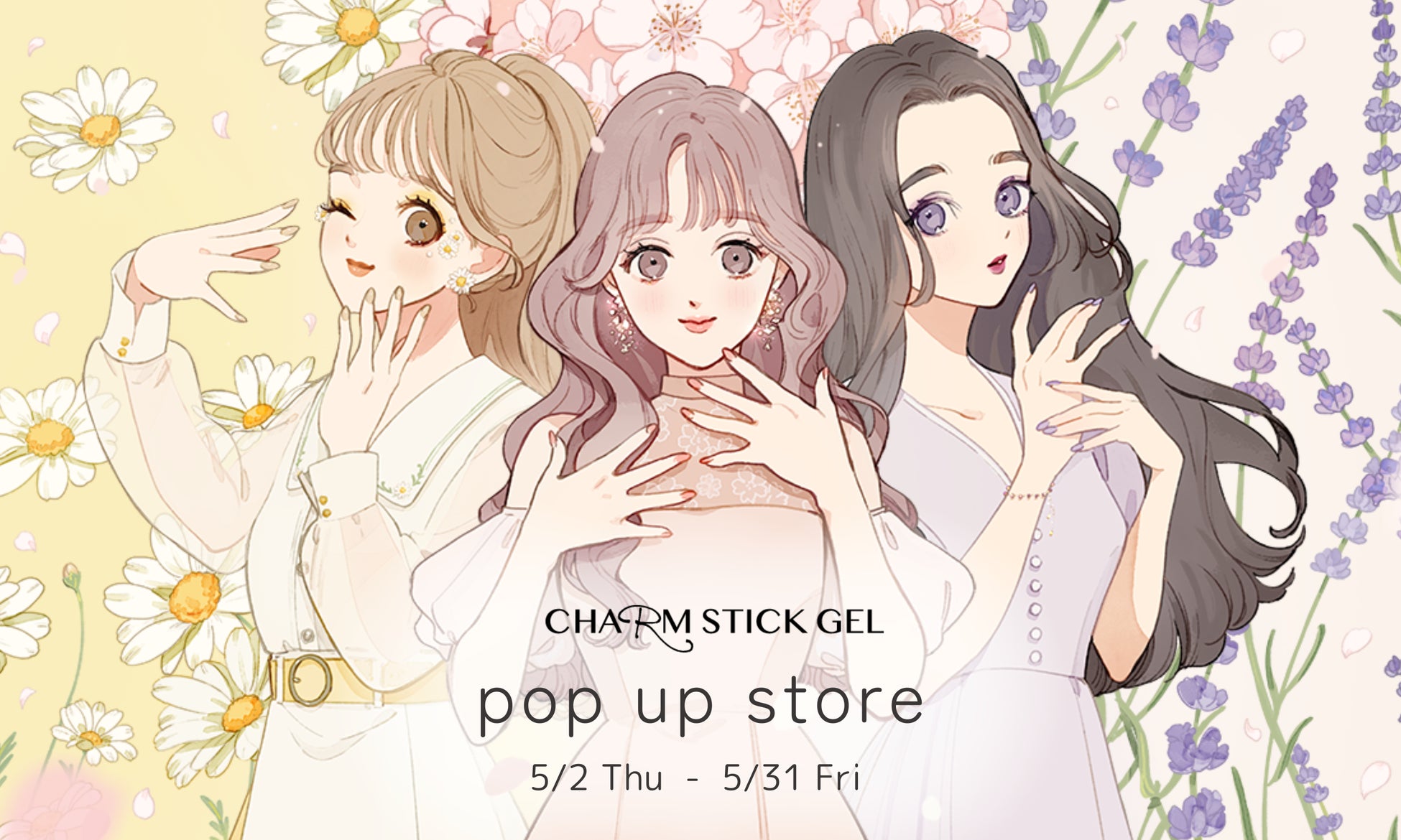 はがせるジェルネイル「チャームスティックジェル」のポップアップストアを開催します。普段はWEBでしか販売していないカラーなど全63色を販売。GWや週末にはスタッフが入店し、無料で選べるアート体験や全色お試しいただけるテスターをご用意いたします。