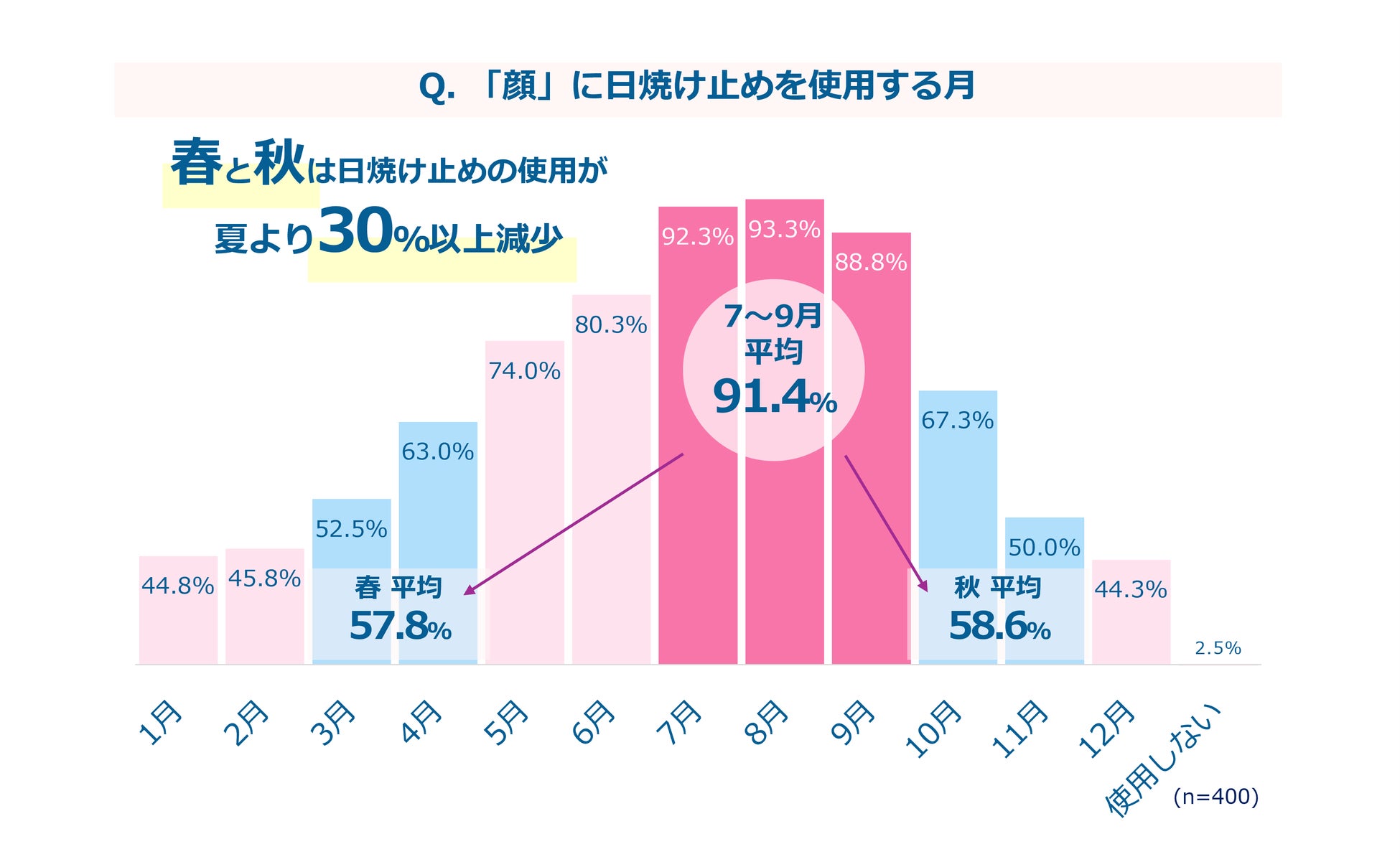 最も高い割合で日焼け対策されていた部位である「顔」に関して、7月・8月・9月は91.4%の人が日焼け止めを使用していたのに対し、3月・4月には57.8%、10月・11月には58.6%が日焼け止めを使用していると回答。夏季と比較してそれぞれ30%以上減少していることが明らかになりました。