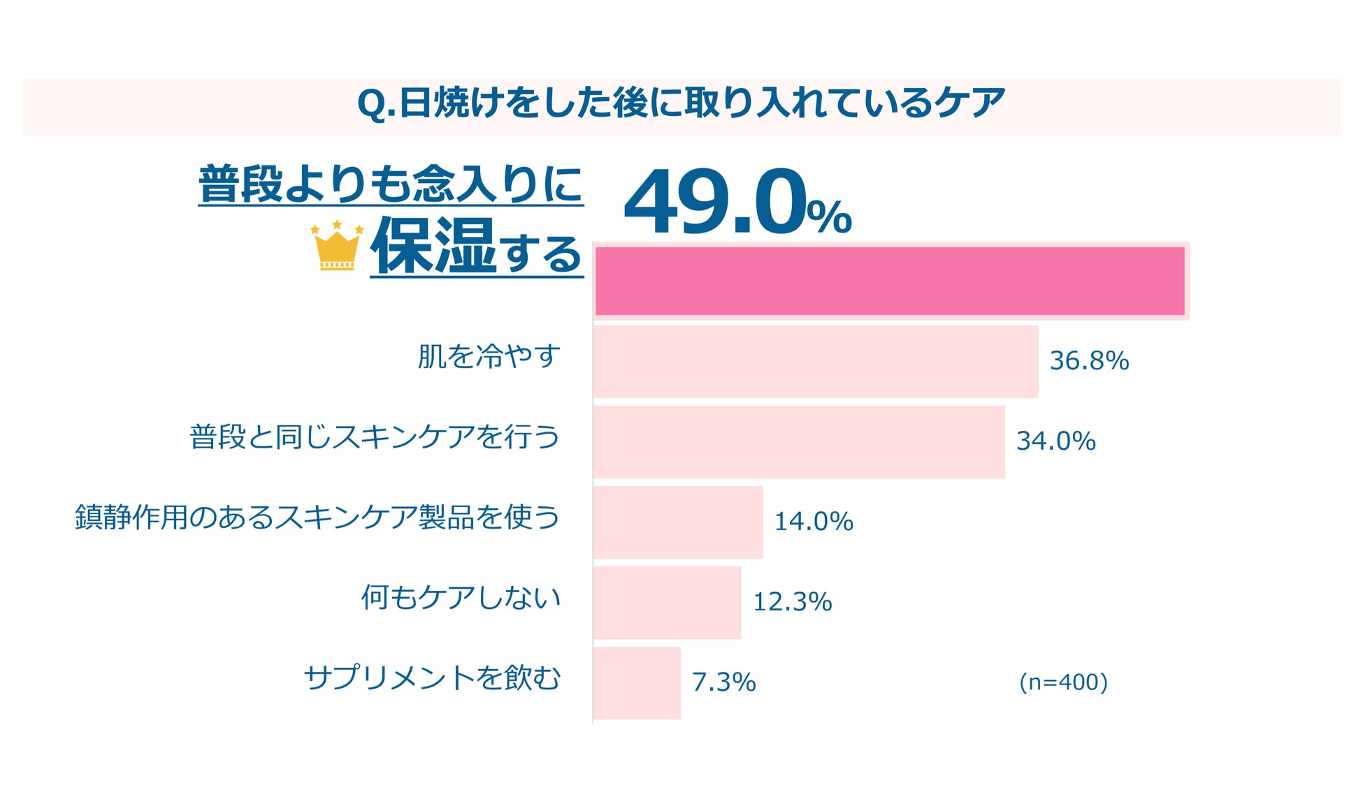 「日焼けをした後にどのようなケアを取り入れていますか。」という質問に対して最も多かった回答は、「普段よりも念入りに保湿する( 49.0%)」で、およそ半数の女性が、念入りな保湿により紫外線ダメージを受けた後の肌をケアしていることがわかりました。