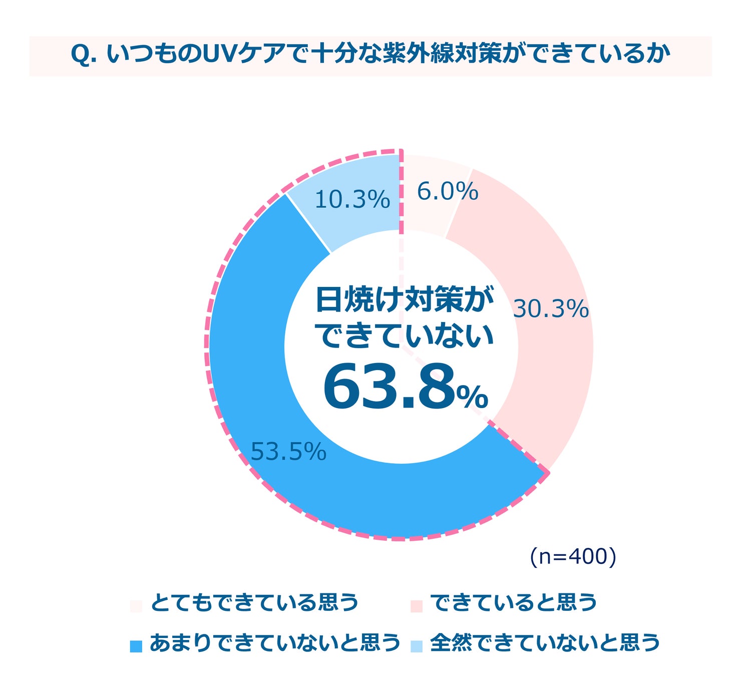 「いつものUVケアで十分な紫外線対策ができていると思いますか。」という質問に対して、63.8%が「できていないと思う」、と回答。また、その理由として最も多かった回答は「塗る日焼け止めを1日に何度も塗り直しできていないから( 59.6 %)」で、日焼け止めの塗り直しが必要であると認識している人が多いことがわかりました。