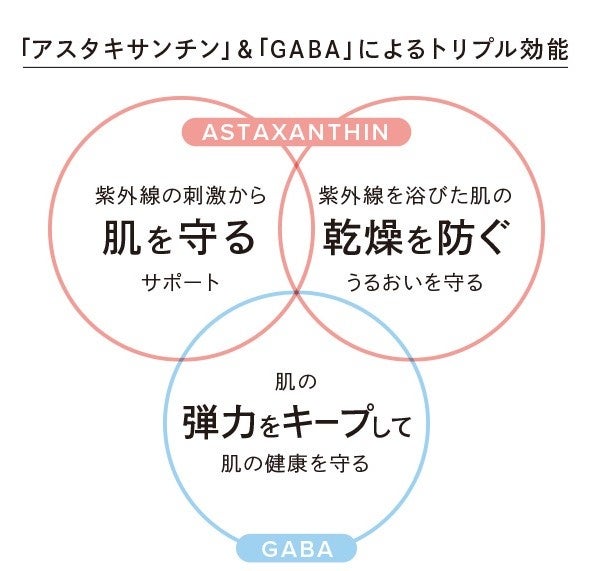 抗酸化作用を持つ「アスタキサンチン」と、弾力維持機能を持つ「アミノ酸GABA」の2つの機能性関与成分を独自配合。アスタキサンチンは、紫外線刺激から肌を守るサポートのほか、紫外線を浴びた肌の乾燥を防ぎ、うるおいを守ります。GABAは、弾力をキープして肌の健康を守ります。いつもの日焼け止めと合わせて、一歩進んだ肌のUVケアを。