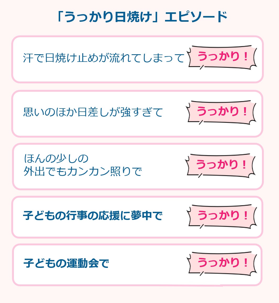 「子どもの行事で一日中外にいるとき」や「汗で日焼け止めが流れてしまった」といった様々な場面でうっかり日焼けを経験!