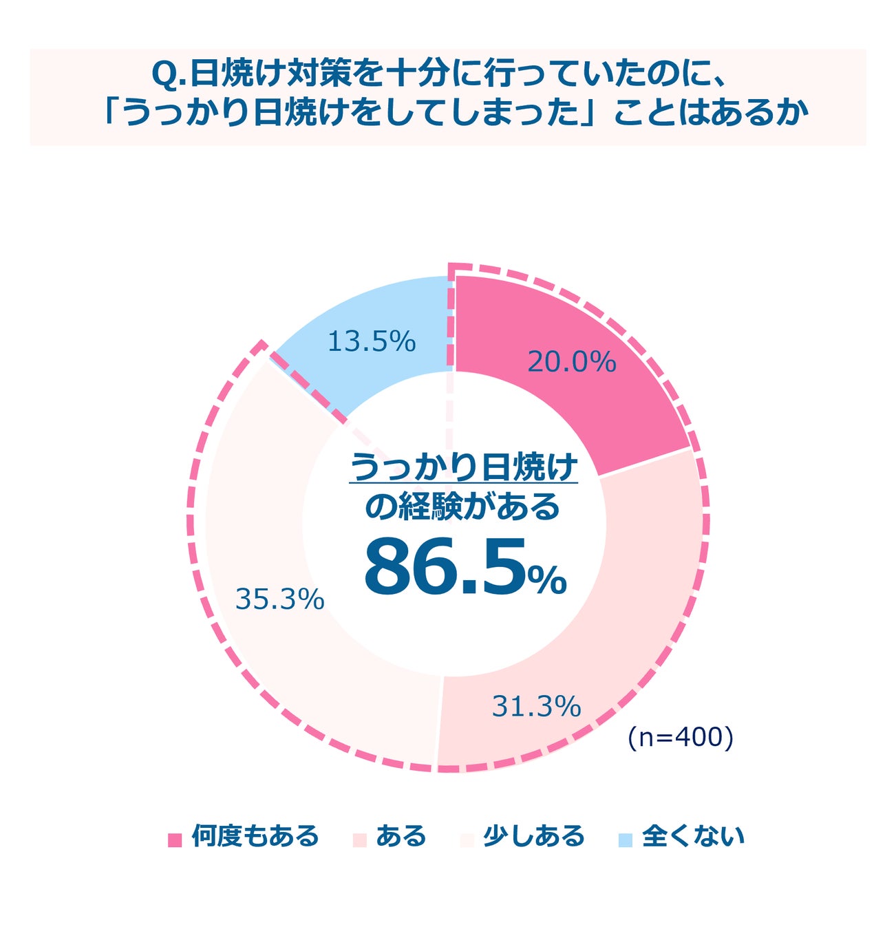 「日焼け対策を十分に行っていたのに、うっかり日焼けをしてしまったことはありますか。」という質問に対して、「何度もある( 20.0%)」、「ある( 31.3%)」、「少しある( 35.3%)」と回答した人は、およそ90%にのぼり、ほとんどの人がうっかり日焼けを経験したことがあるという結果になりました。