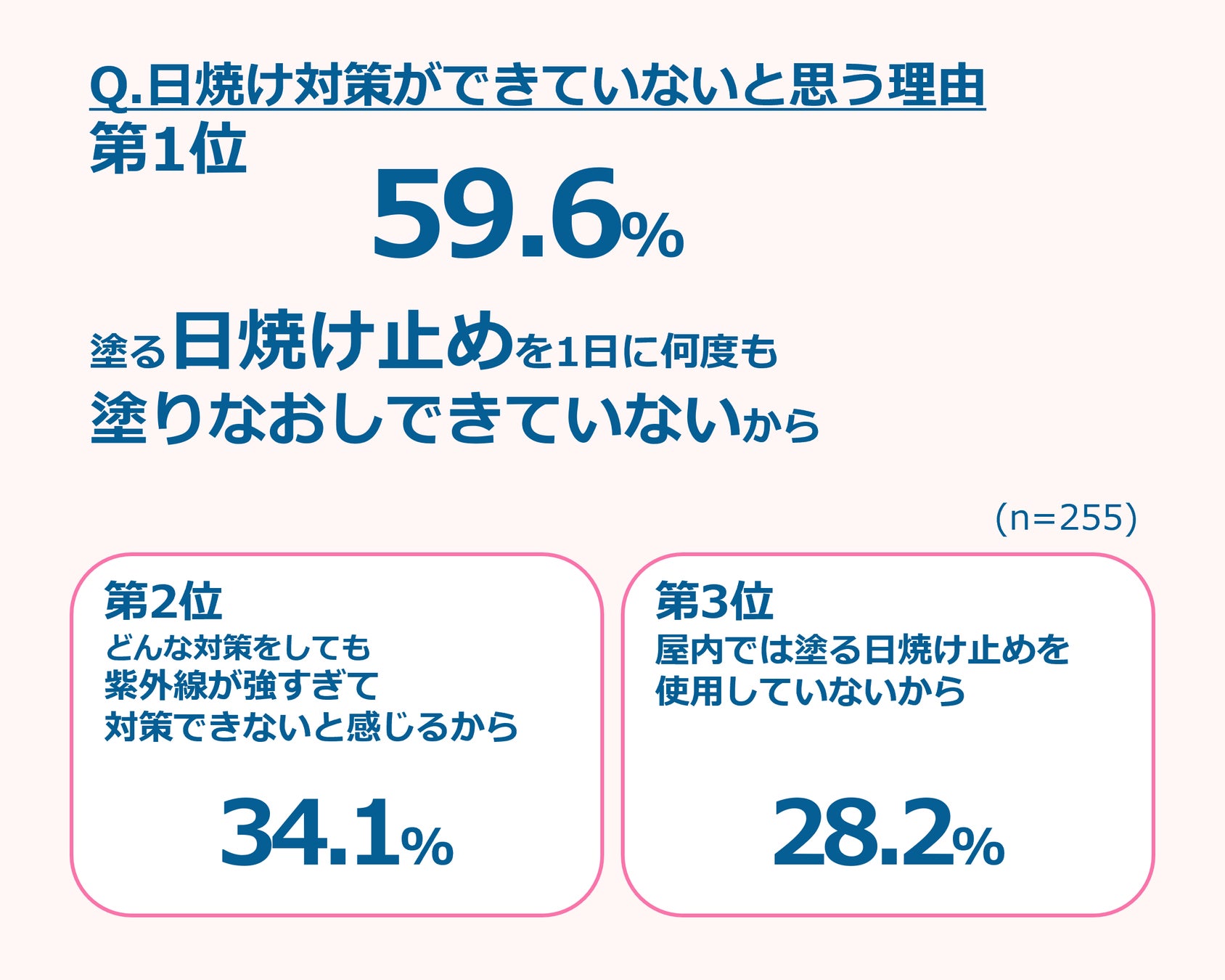 一方、「十分な紫外線対策ができていないと思う」人の66.7%が日焼け止めを一度も塗り直していない結果に。塗り直しが必要であると認識しているにもかかわらず、実際には塗り直しができていないということが判明しました。