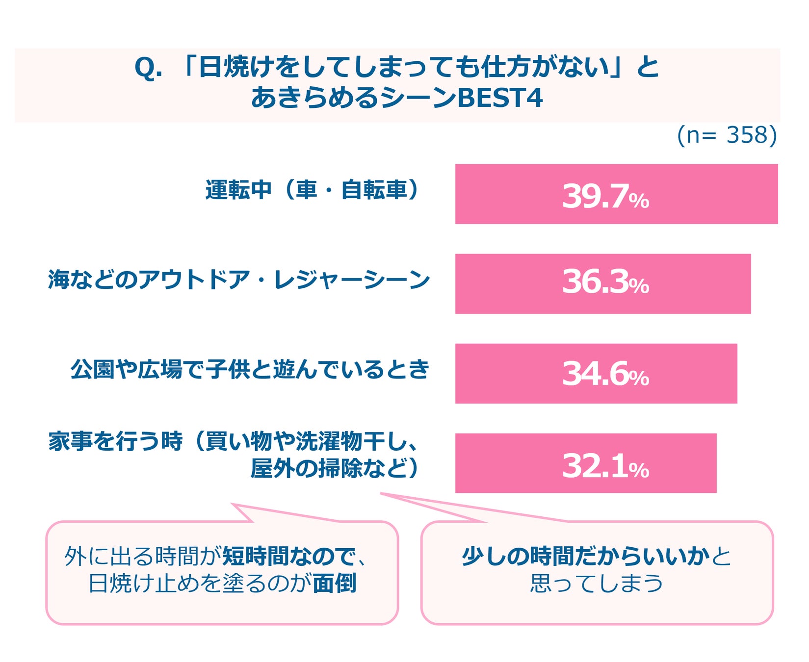 日常生活で「日焼けをしてしまっても仕方がない」とあきらめるシーンがあるかを聞くと、89.5%が「ある」と回答し、90%以上が“あきらめ日焼け”を実感していることが明らかに。最も多かった回答は「運転中(車・自転車)(39.7%)」で、「海などのアウトドア・レジャーシーン(36.3%)」、「公園や広場で子供と遊んでいるとき(34.6%)」、「家事を行う時(買い物や洗濯物干し、屋外の掃除など)(32.1%)」が続きました。紫外線に長時間さらされるシーンが多く挙げられている一方、「家事」も日焼けをあきらめるシーンとして多く挙げられ、「外に出る時間が短時間なので、日焼け止めを塗るのが面倒」「少しの時間だからいいかと思ってしまう」などの、少しの時間だからとあきらめてしまうが、その油断が日焼けに繋がっている人が多いことが分かりました。