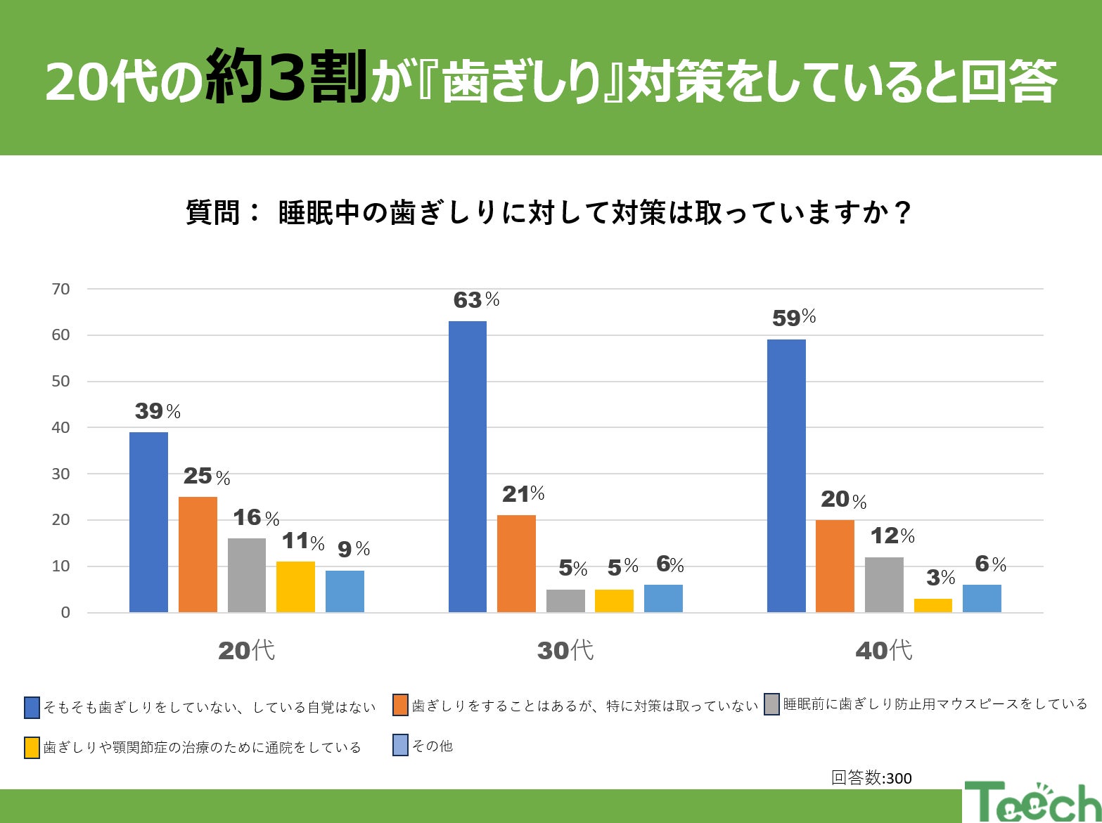 20代のうち16%が睡眠前に歯ぎしり防止用マウスピースを使用していることが分かり、11%は歯ぎしりや顎関節症の治療のために定期的に通院しています。これらの数値は、歯ぎしり問題に対して積極的な対応をしていることを示しておりそれは20代の約3割にもおよびます。