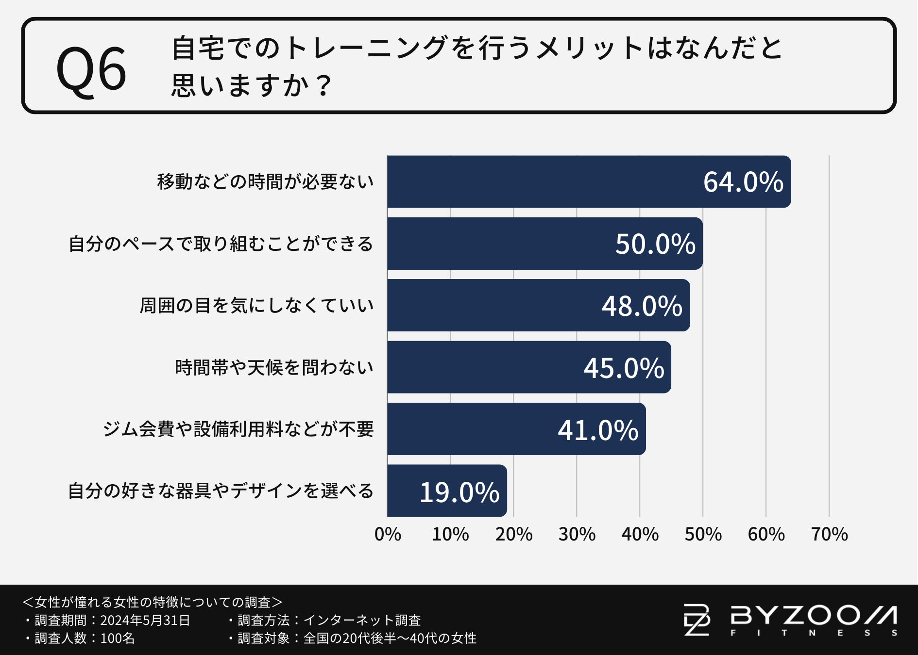 そこで、自宅でのトレーニングを行うメリットはなんだと思うか伺ったところ、「移動などの時間が必要ない(64.0%)」「自分のペースで取り組むことができる(50.0%)」「周囲の目を気にしなくていい(48.0%)」という回答が集まりました。