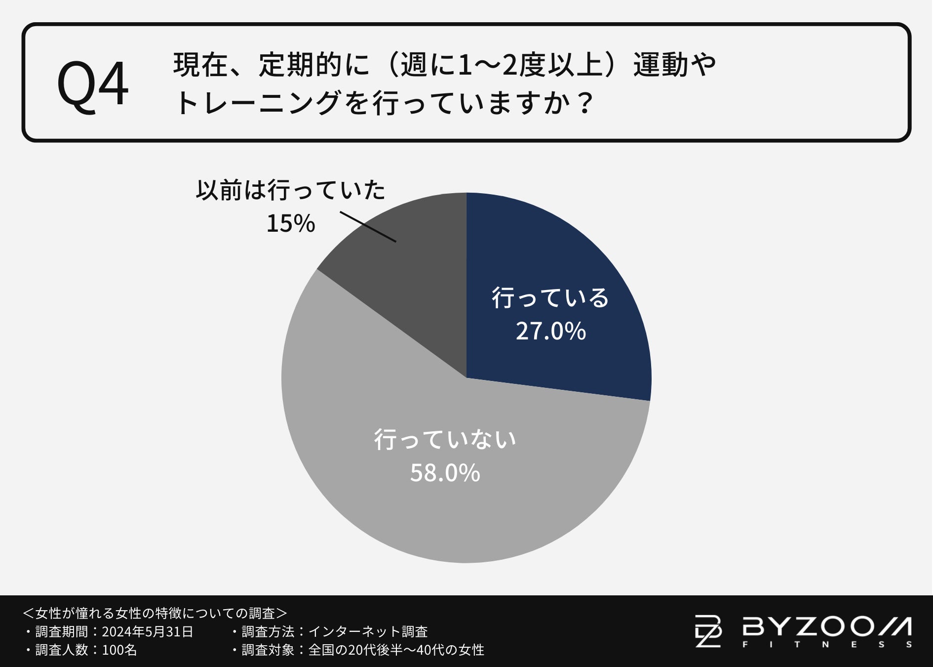 現在、定期的に(週に1〜2回以上)運動やトレーニングを行っているか伺ったところ、「行っていない(58.0%)」「行っている(27.0%)」「以前は行っていた(15.0%)」という結果となりました。