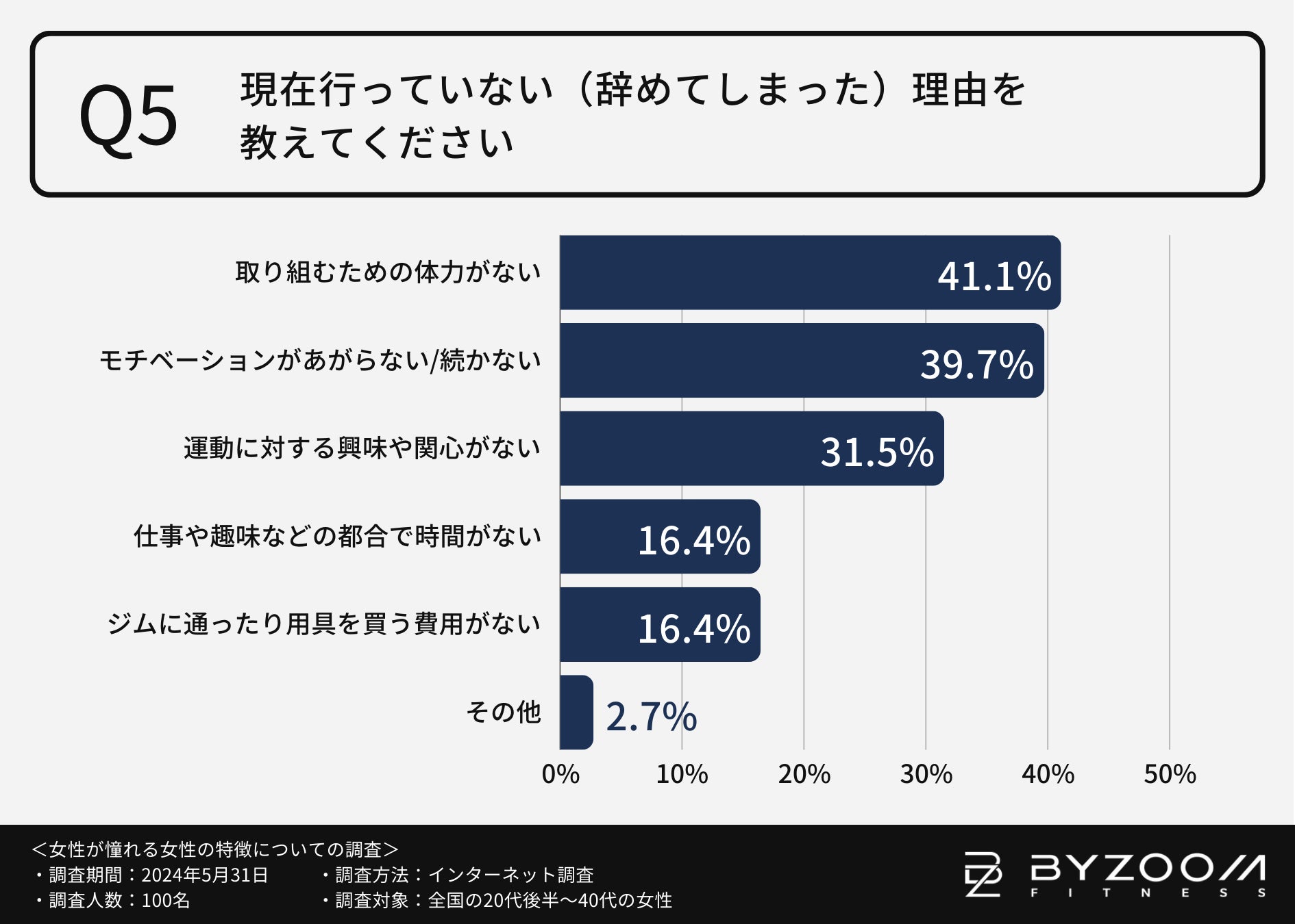 運動やトレーニングを行っていない方が多くいましたが、現在行っていない(辞めてしまった)と回答した方に理由を伺ってみたところ、「取り組むための体力がない(41.1%)」「モチベーションがあがらない/続かない(39.8%)」「運動に対する興味や関心がない(31.5%)」という回答が集まりました。