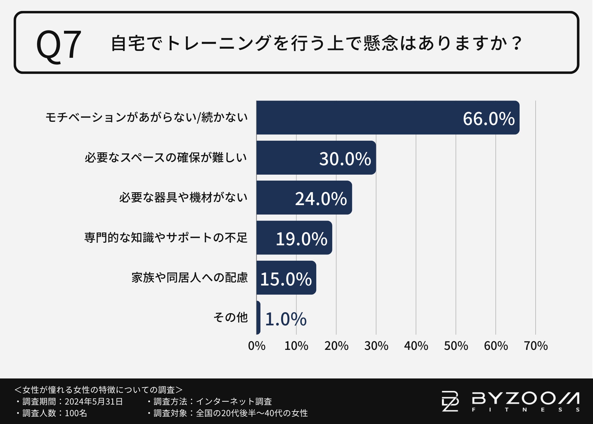 自宅トレーニングを行う上での懸念点を伺ったところ、「モチベーションがあがらない/続かない(66.0%)」という回答が最も多く集まりました。
