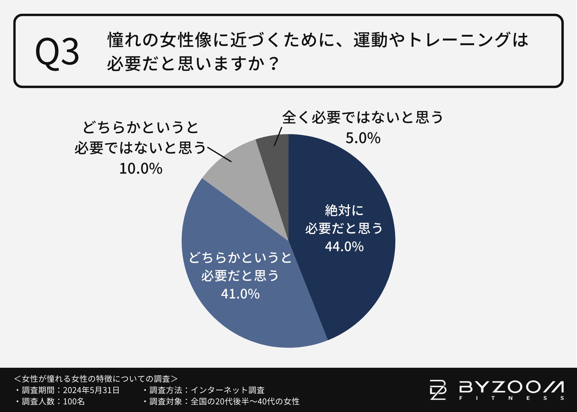 次に、憧れの女性像に近づくために、運動やトレーニングは必要だと思うか伺ったところ、「絶対に必要だと思う(44.0%)」「どちらかというと必要だと思う(41.0%)」という回答が集まり、実に8割以上の方が必要だと思っていることがわかりました。