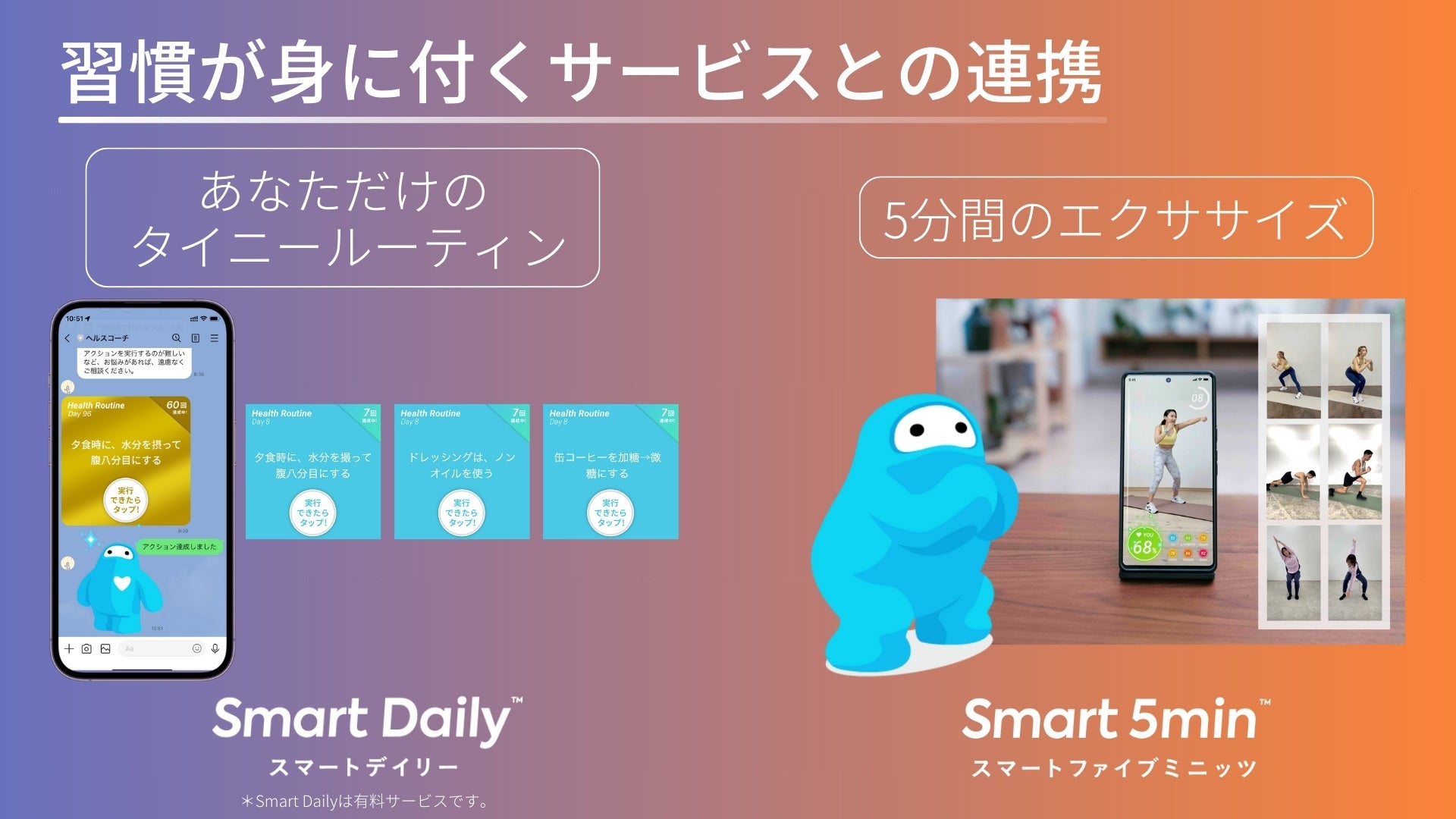 専用アプリでは、パーソナルヘルスケアAI「ウェリーくん」が、ユーザーの健康管理にとって重要な変化を知らせたり、励ましやアドバイスを送ったりする新機能を追加しました。また、ユーザー個人に合わせて始めやすく続けやすい「タイニールーティン」(毎日無理なく続けられる健康習慣)を提案し、実行まで伴走する新機能も搭載するほか、issinの提供する生活習慣改善サービス「Smart Daily」や、運動習慣サービス「Smart 5min」とも連携して、日常生活に溶け込んだパーソナルヘルスケアを実現します。