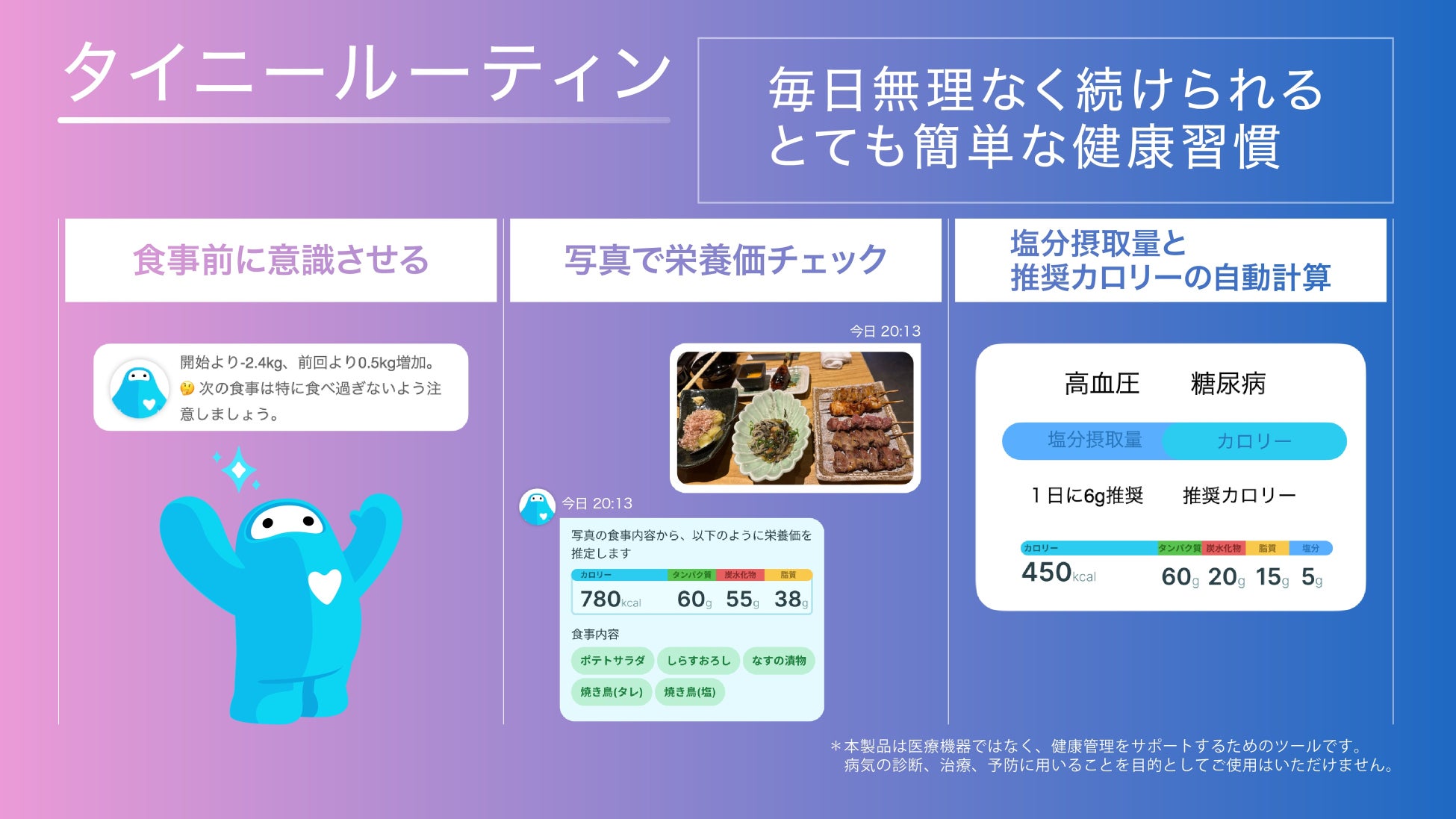 減量や生活習慣改善の目標がある場合、その目標に近づくために、ユーザー個人に合わせて始めやすく続けやすい「タイニールーティン」(毎日無理なく続けられる健康習慣)を、パーソナルヘルスケアAI「ウェリーくん」を通じて提案し、実行まで伴走します。