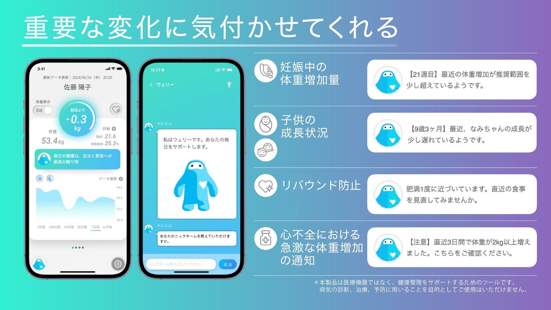 従来の多くの体重計とは異なり、ニーズに応える形で機能追加・アップデートを繰り返し行っている点が特徴で、目的やライフステージに合わせた6つの体重管理モードや、家族間のプライバシーにも配慮した共有機能が実装されています。また、「AI体重未来予測」機能により、ユーザーのデータをAIが解析し、未来の体重変化の傾向を先読みし予測します。この機能によって、ダイエットのモチベーション向上や、ダイエット後のリバウンド防止、高齢者のフレイル予防に繋がります。さらには、パーソナルヘルスケアAI「ウェリーくん」があなたの変化に気づき、生活習慣の改善案を提案し、寄り添いながらナビゲートします。