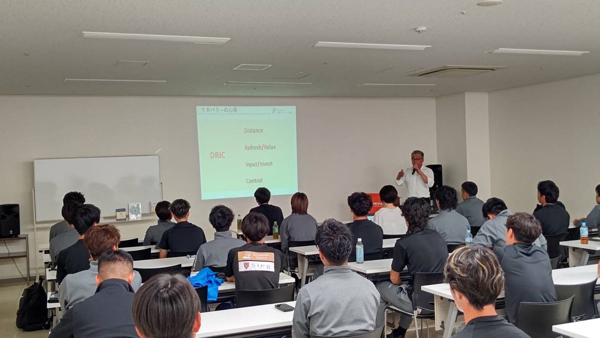 今回、更なるパフォーマンス向上を目指される「厚木はやぶさFC」とともに取り組みができないかと考える中で、選手・スタッフに対して、「休養の重要性」をテーマにしたセミナーを開催。当社の執行役員CPOであり、一般社団法人日本リカバリー協会代表理事の片野秀樹が、パフォーマンス向上のための「休養」の必要性、疲労と休養の関係性、休養方法などを伝えました。