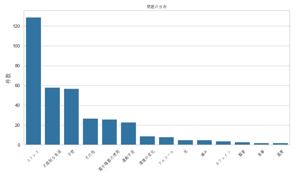 問題の分布:不眠の原因は主にストレス。次いで不規則な生活や不安。