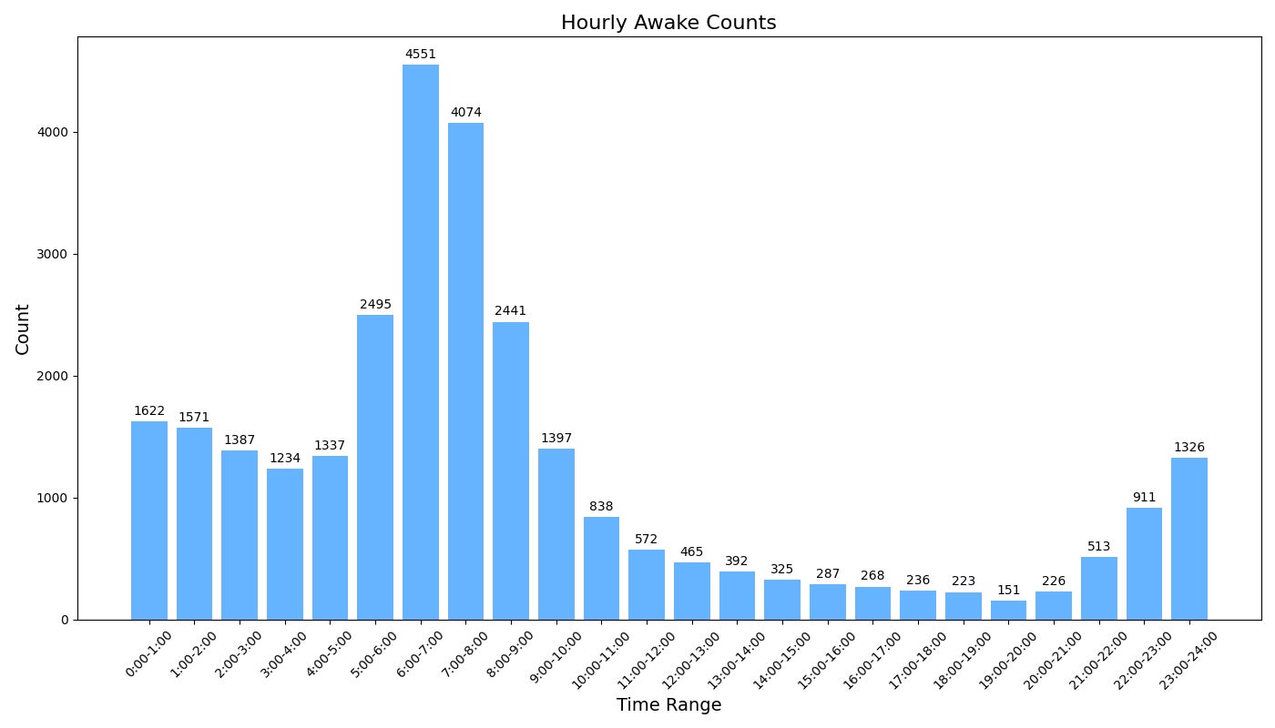 6時〜8時に多くの起床が見られます。さらに、昼間よりも深夜帯の方に起床時刻が多く見られます。深夜帯に中途覚醒による起床が増えていることが伺えます。