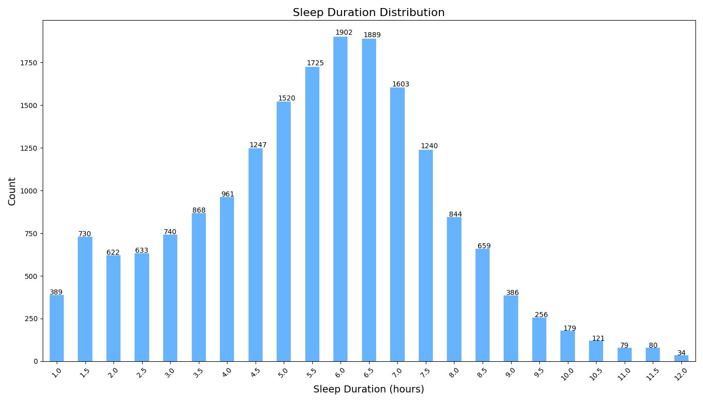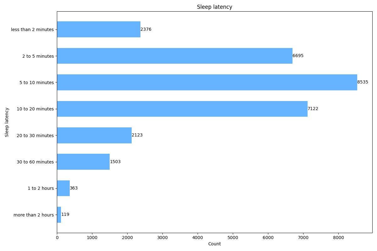 一般成人の睡眠時間は7時間以上が適正と言われますが、やや短い6時間〜6.5時間がもっとも多い睡眠時間でした。一方で、1.5時間の短い睡眠も多いことが示されました。